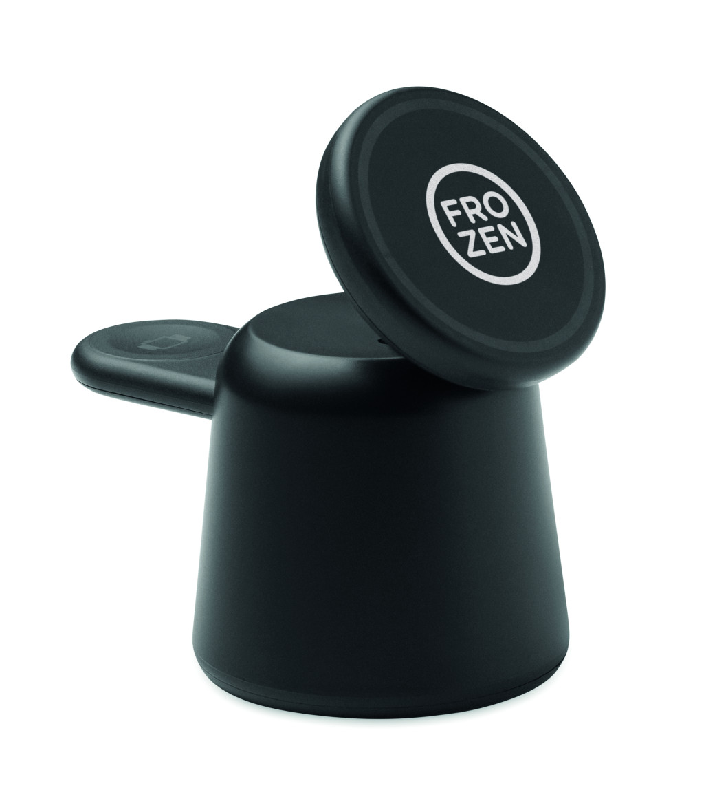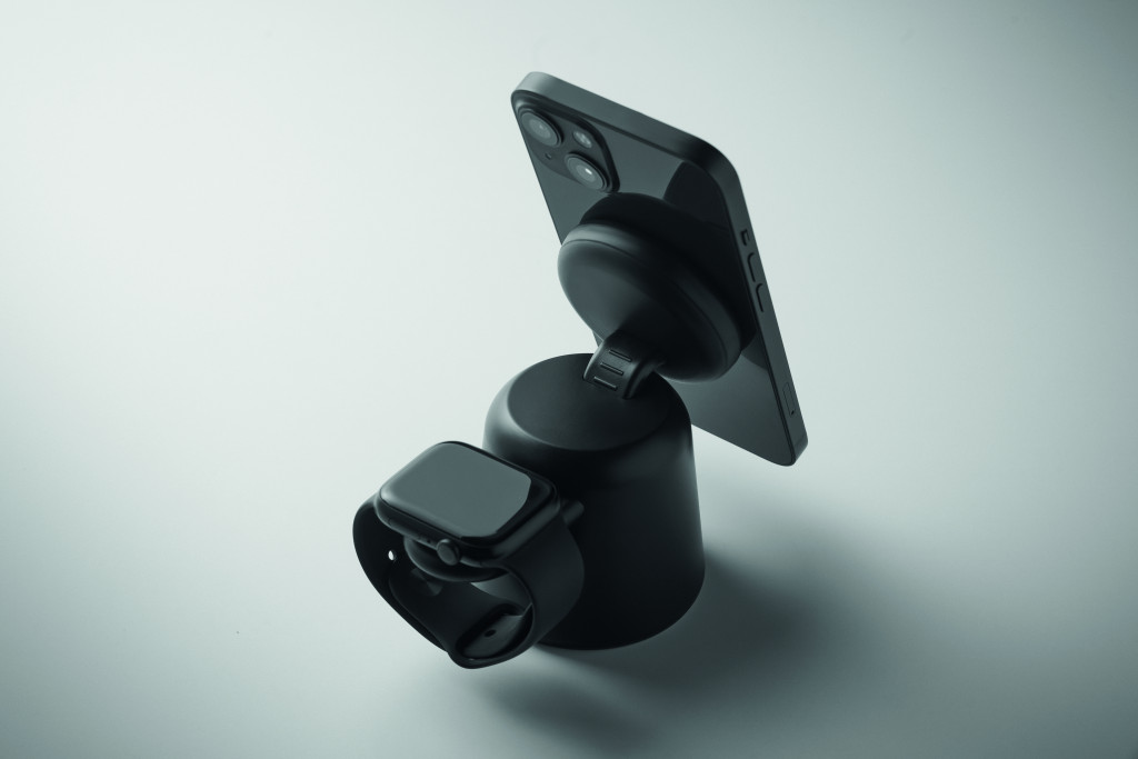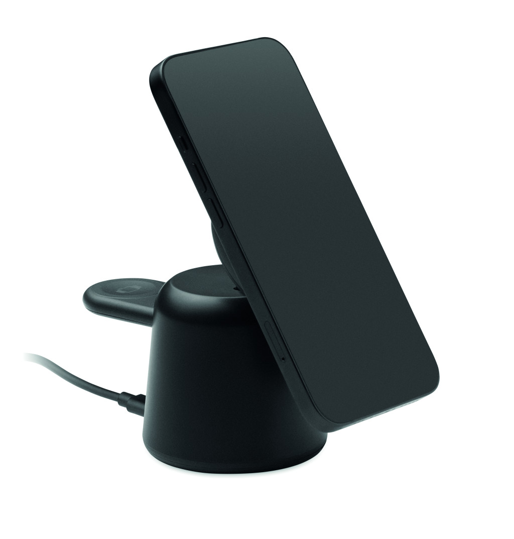 3 az 1-ben töltőállomás ABS-ből. 15 W-os mágneses vezeték nélküli töltő telefonhoz és TWS-hez, telefontartó funkcióval, valamint okosóra töltő (csak iOS). iPhone® 12 és újabb készülékekkel kompatibilis. További fémgyűrűt tartalmaz a nem mágneses telefonok támogatásához.