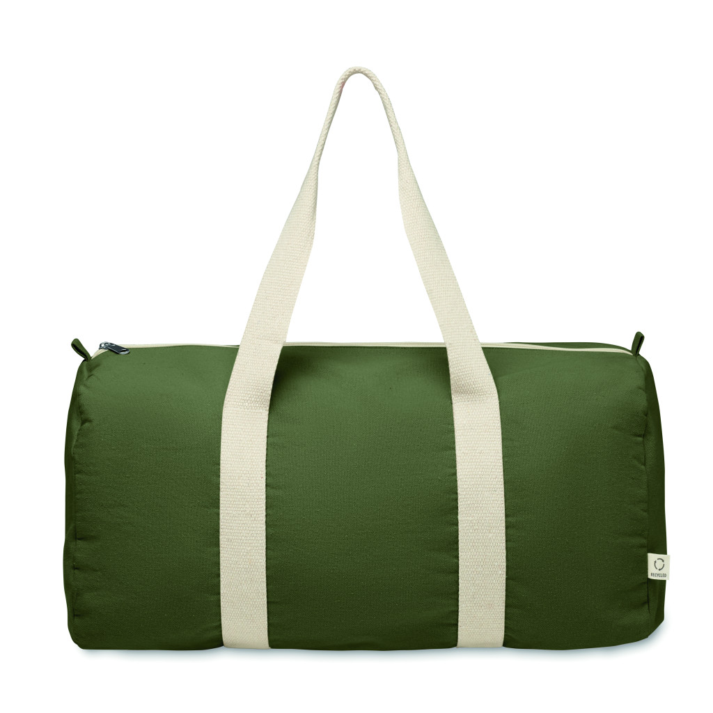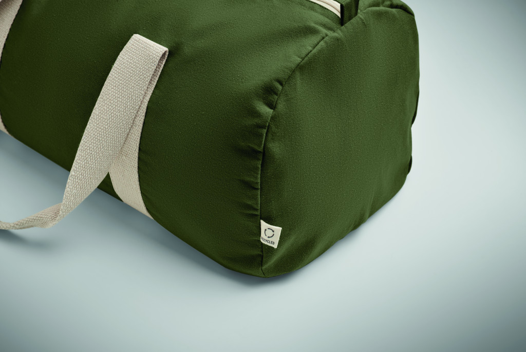 Sport- vagy utazótáska cipzáras oldalsó rekesszel és cipzáras belső zsebbel, 320 g/m² vastag újrahasznosított pamutból (80%) és újrahasznosított poliészterből (20%), hosszú fülekkel.
