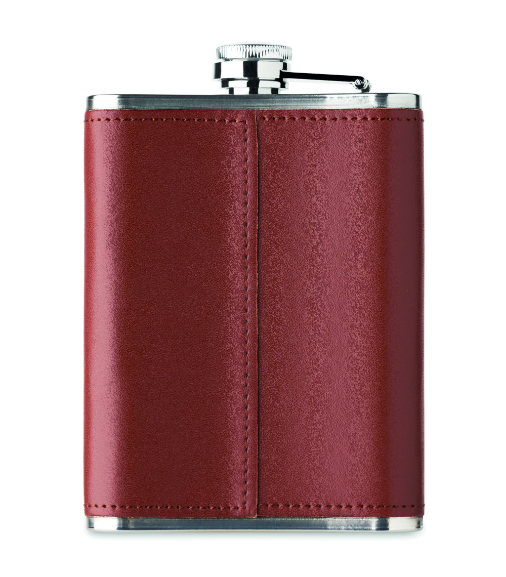 Vékony italtartó laposüveg rozsdamentes acélból, PU-bőr borítással. Űrtartalom: 200 ml.