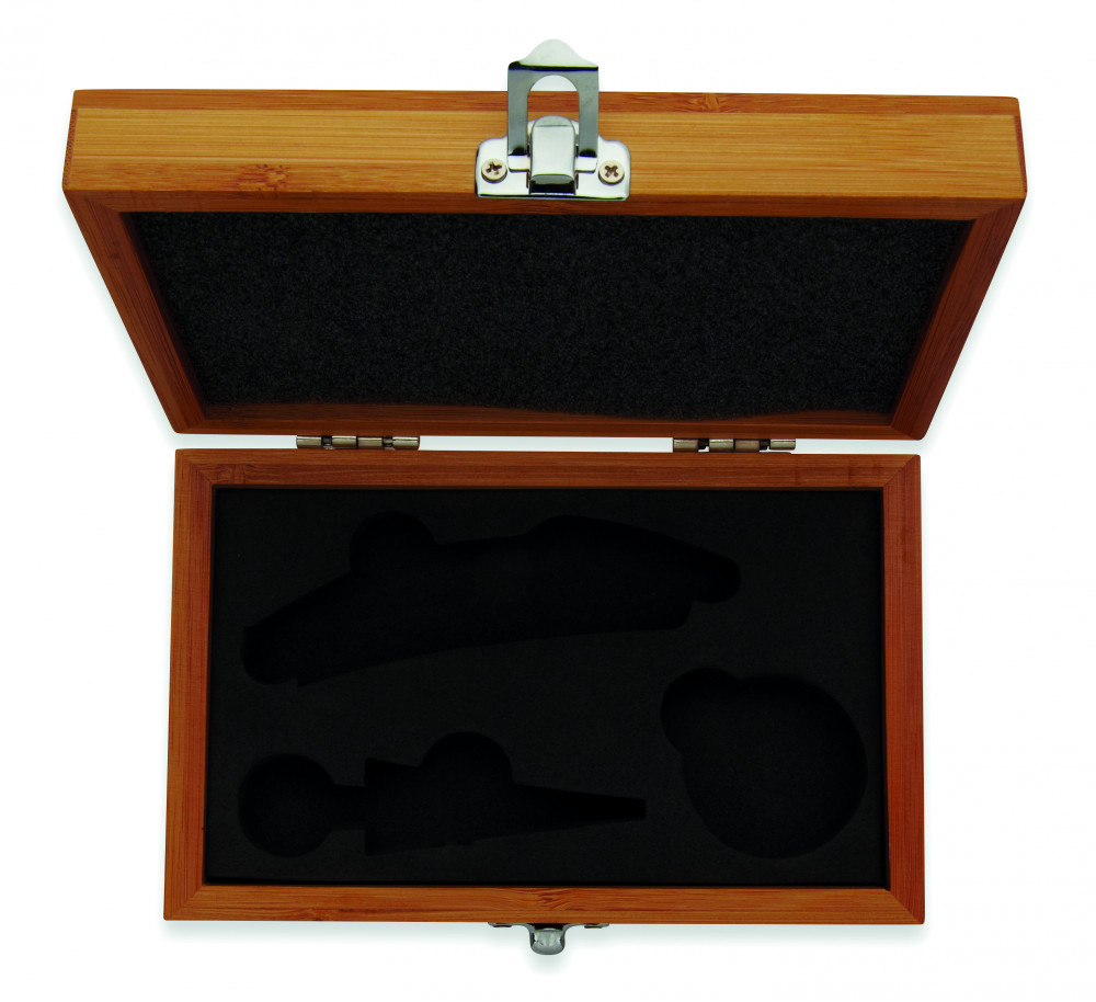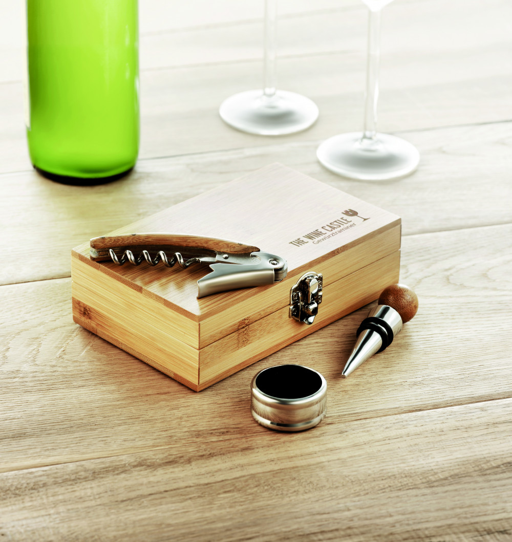 Boros készlet bambusz dobozban. Dugóhúzót, cseppfogó gyűrűt és palack visszazárót tartalmaz, rozsdamentes acélból és bambuszból. A bambusz természetes anyag, színében, mintázatában és méretében esetenként eltérő lehet.