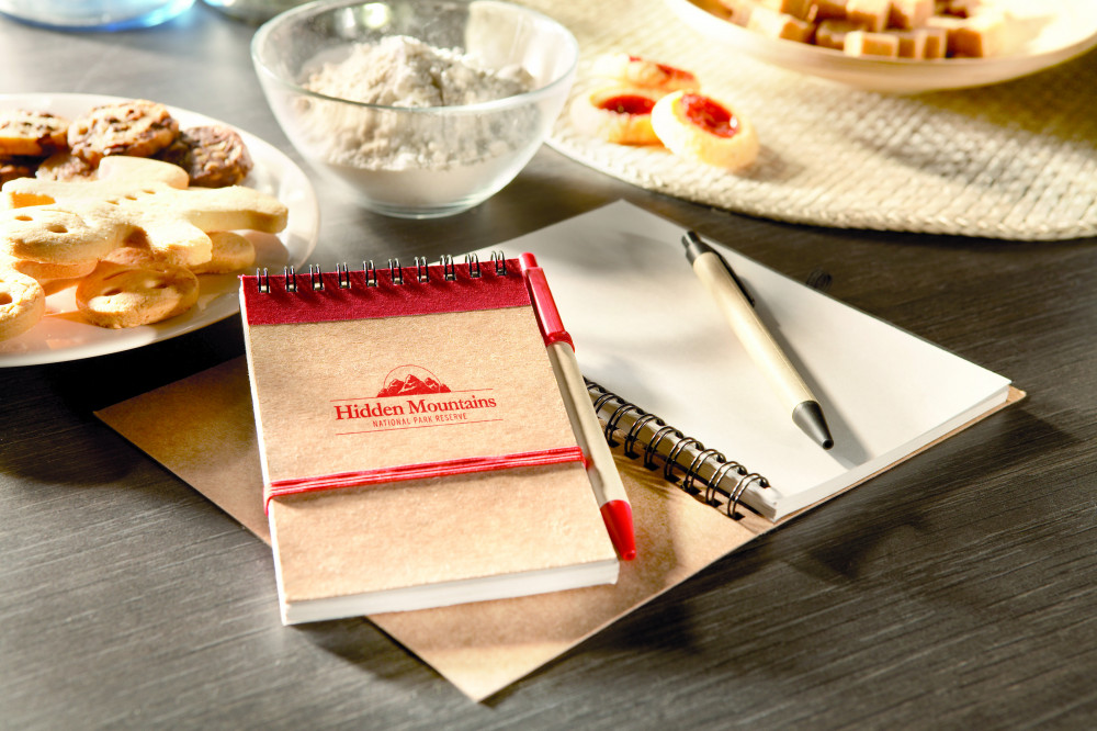 A6 újrahasznosított papírból készült jegyzetfüzet, hozzáillő tollal. Ikerspirálozott. 140 sima oldal (70 lap) újrahasznosított papírból. Illeszkedő színű elasztikus zárópánt és tolltartó hurok. Nyomógombos golyóstoll újrahasznosított karton tolltesttel, színben illeszkedő, biológiailag lebomló műanyag szerelvényekkel. Kéken író betéttel. FSC®-certified | FSC MIX, P7.1, FSC-C213206