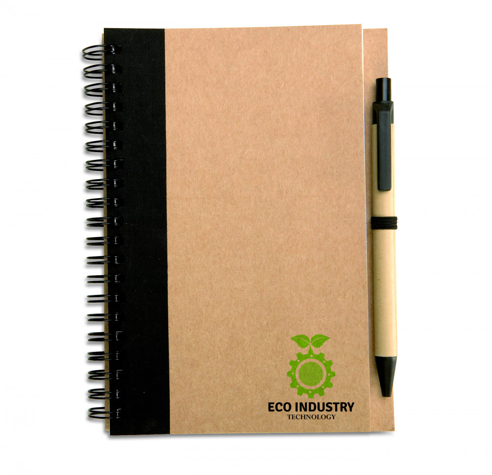 B6 újrahasznosított papírból készült jegyzetfüzet, hozzáillő tollal. Ikerspirálozott. 140 sima oldal (70 lap) újrahasznosított papírból. Illeszkedő színű elasztikus tolltartó hurok. Nyomógombos golyóstoll újrahasznosított karton tolltesttel, színben illeszkedő, biológiailag lebomló műanyag szerelvényekkel. Kéken író betéttel.