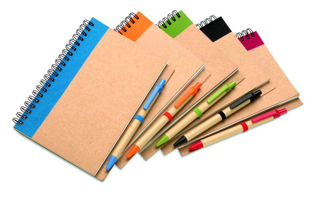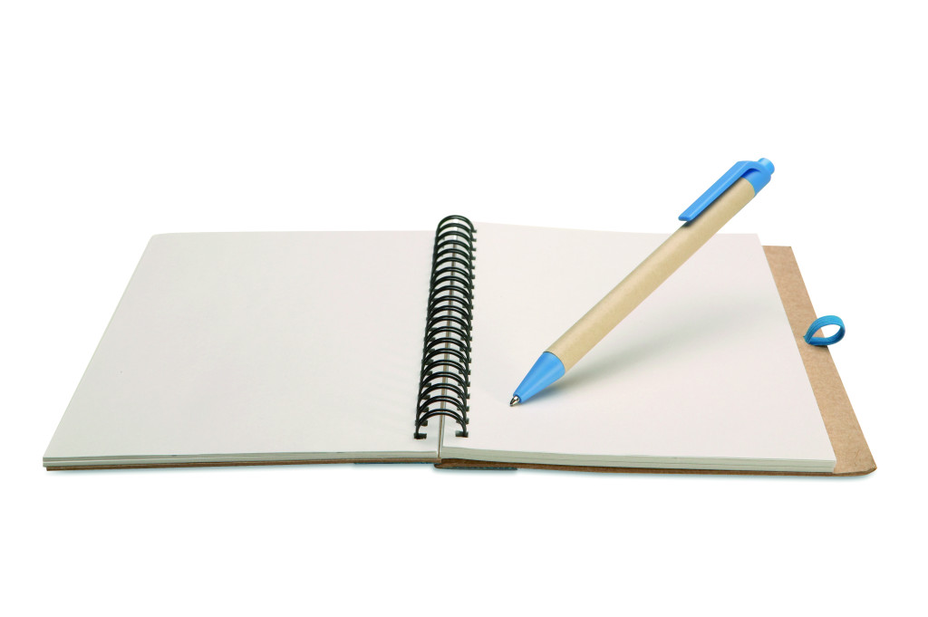 B6 újrahasznosított papírból készült jegyzetfüzet, hozzáillő tollal. Ikerspirálozott. 140 sima oldal (70 lap) újrahasznosított papírból. Illeszkedő színű elasztikus tolltartó hurok. Nyomógombos golyóstoll újrahasznosított karton tolltesttel, színben illeszkedő, biológiailag lebomló műanyag szerelvényekkel. Kéken író betéttel.