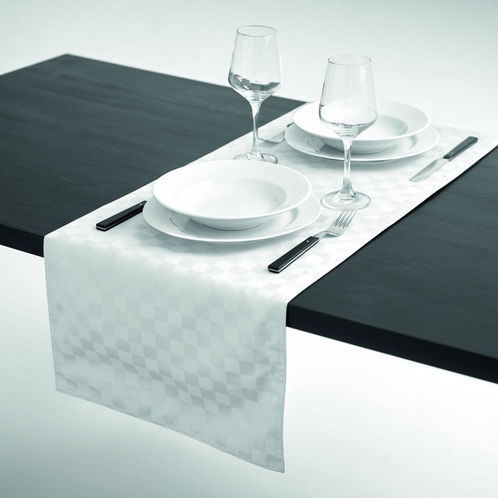 Asztali futó terítő 185 g vastag poliészterből, mikroszálas és nemszőtt béléssel, az elülső oldalon vízlepergető bevonattal. Méret: 140x40 cm.