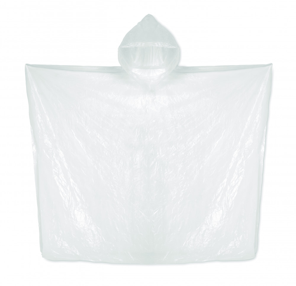 Összehajtható kapucnis esőponcsó, biológiailag lebomló anyagból, szintén biológiailag lebomló tasakba csomagolva.