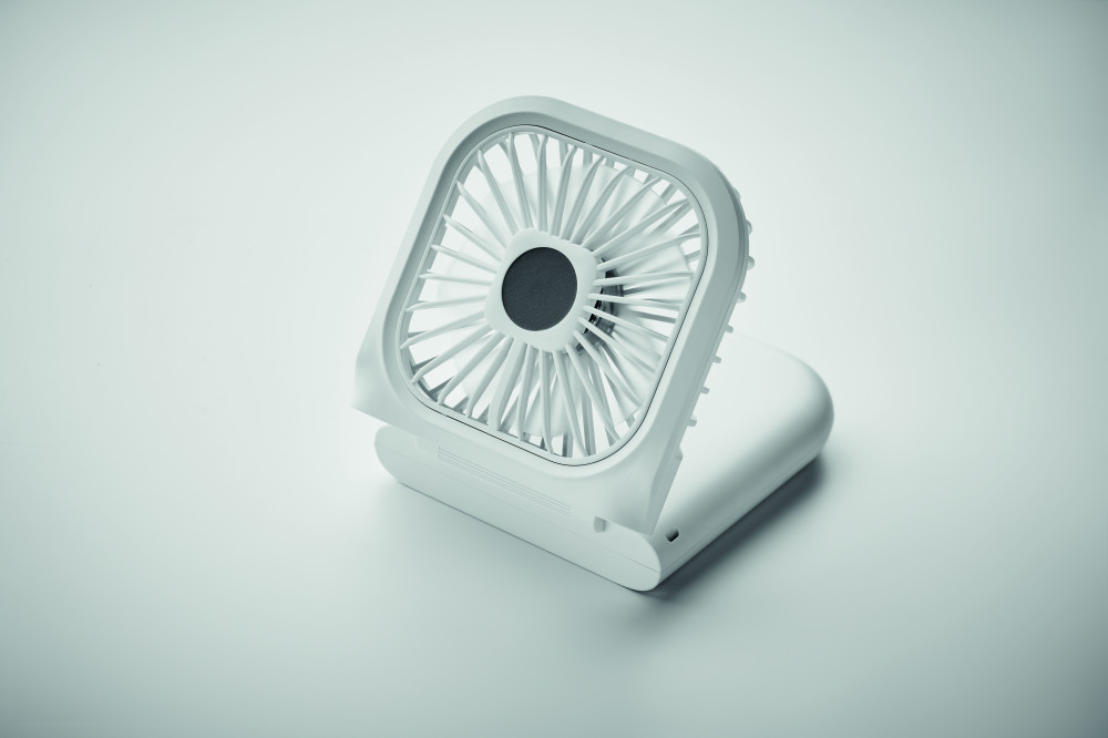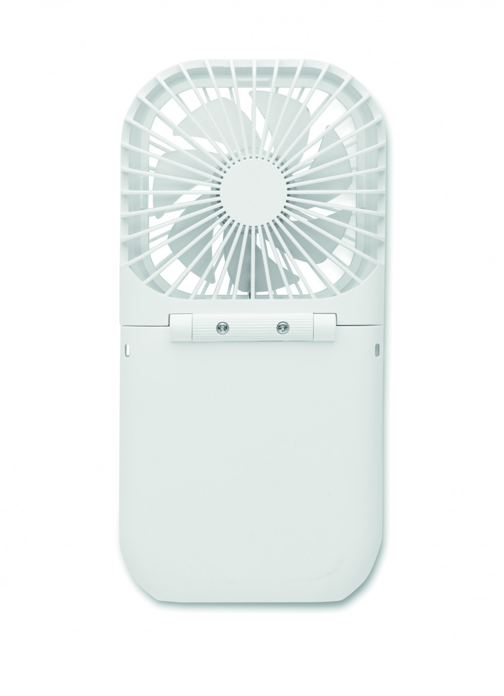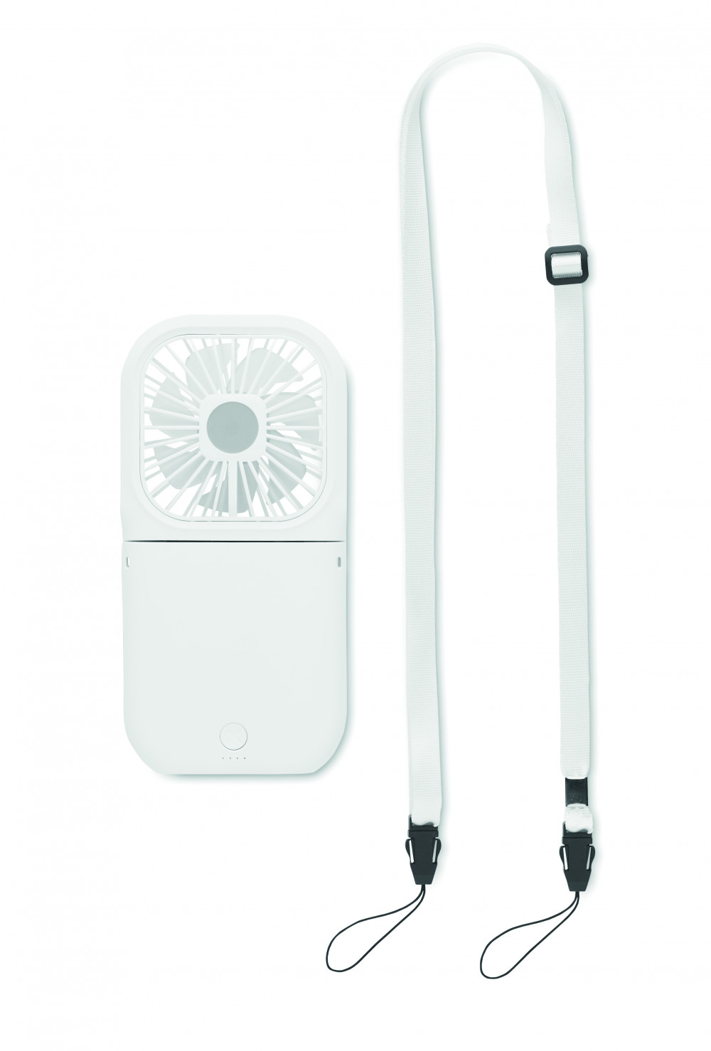 Hordozható, összecsukható ventilátor állítható nyakpánttal. 3 sebességfokozat. Összehajtva asztali ventilátorként is használható. USB porton tölthető 3000 mAh kapacitású külső akkumulátor funkcióval.