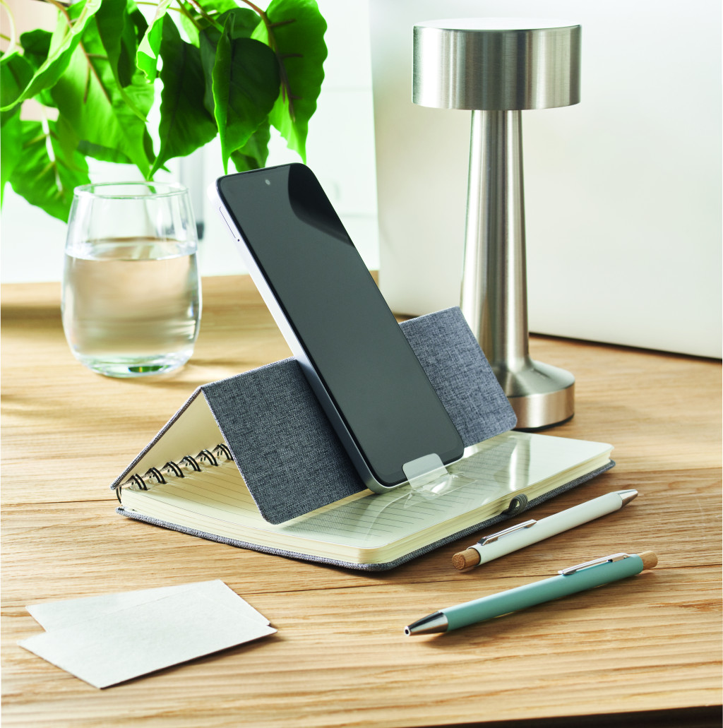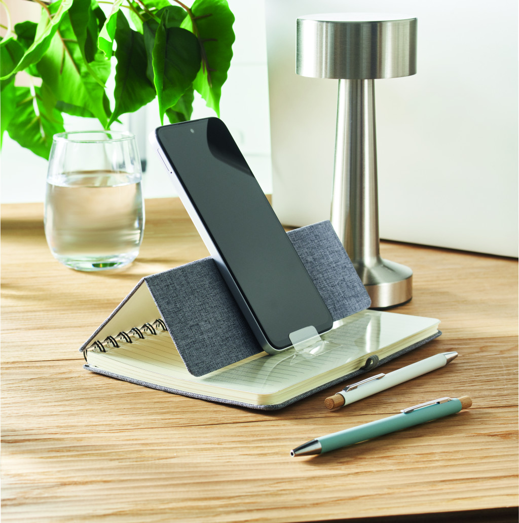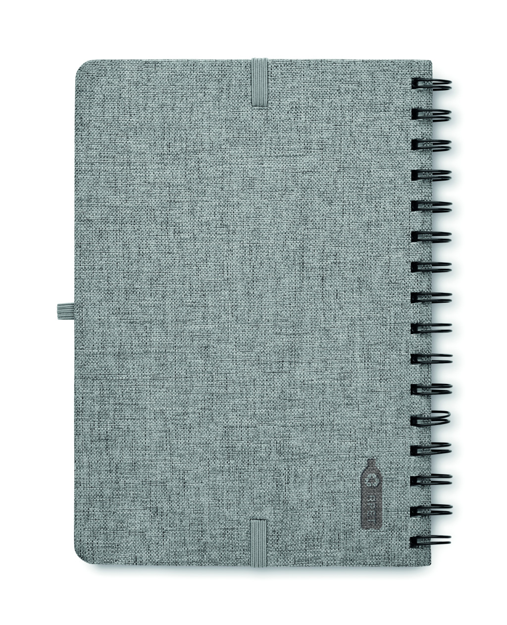 A5 jegyzetfüzet 600D RPET keménytáblás borítóval, okostelefon állvány funkcióval. Spirálozott. 160 vonalas oldal (80 lap). 70 g/m² újrahasznosított papír. Elasztikus zárópánt.