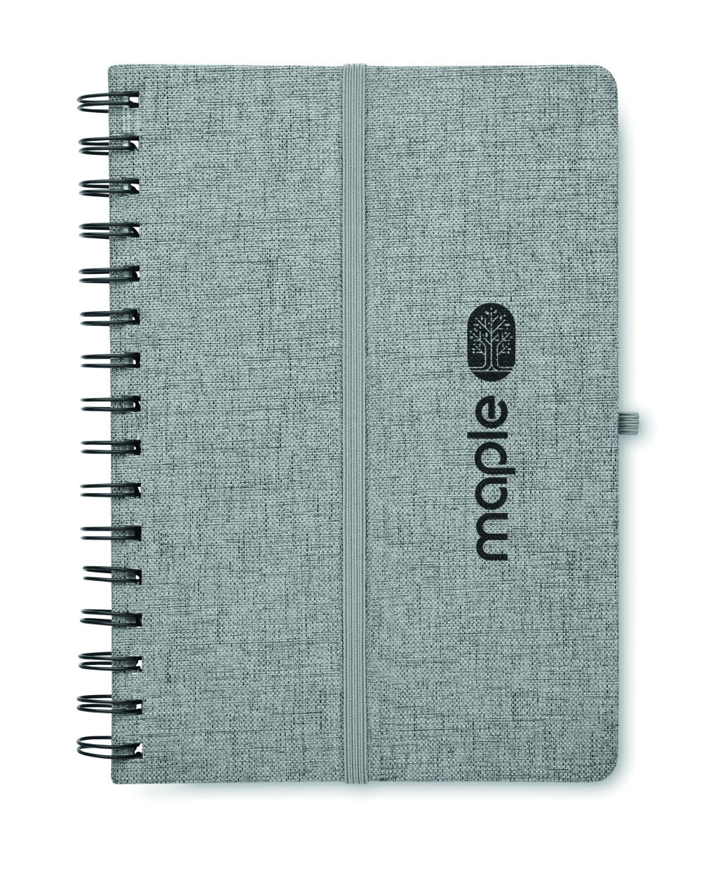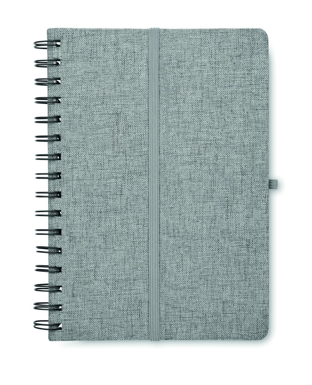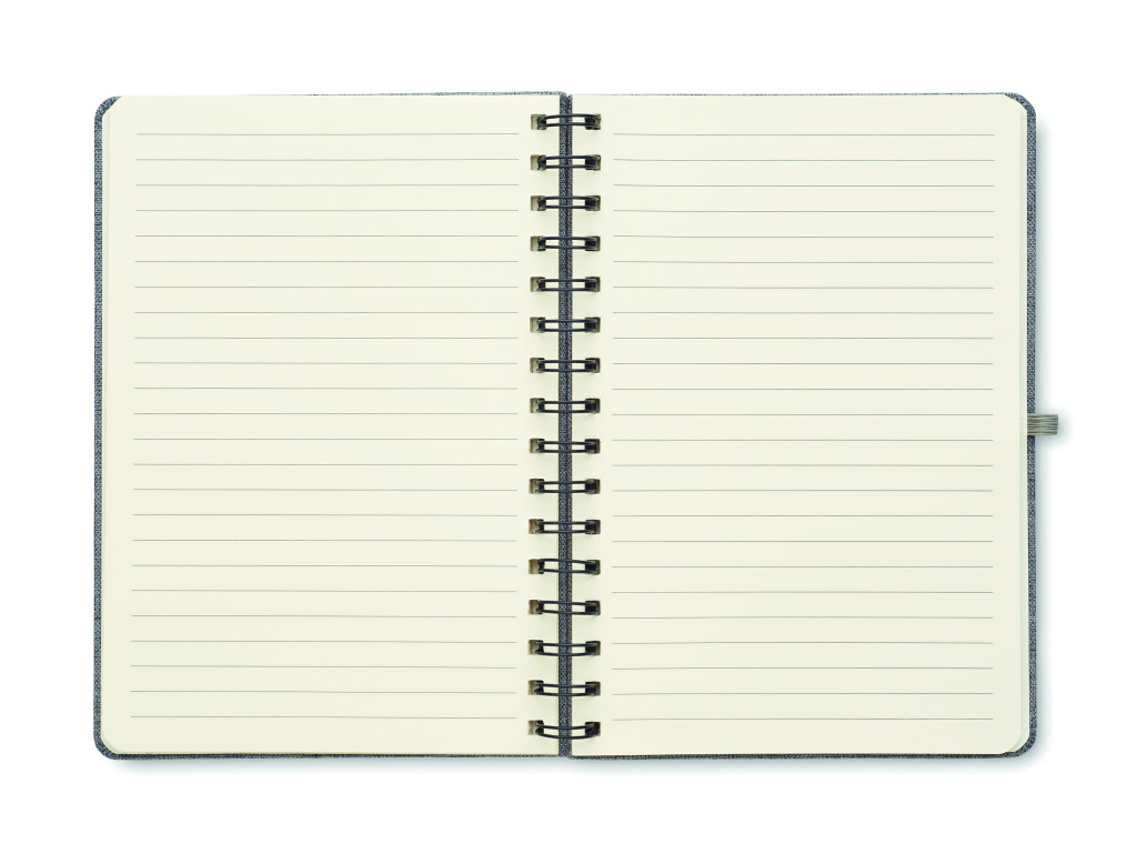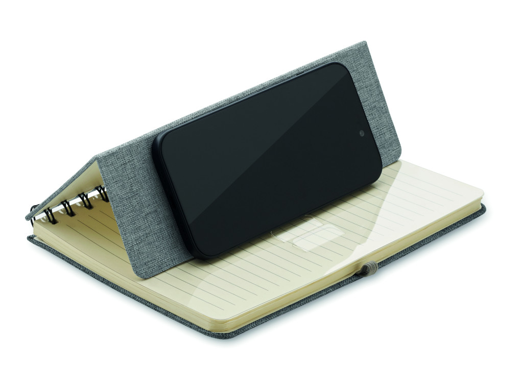 A5 jegyzetfüzet 600D RPET keménytáblás borítóval, okostelefon állvány funkcióval. Spirálozott. 160 vonalas oldal (80 lap). 70 g/m² újrahasznosított papír. Elasztikus zárópánt.
