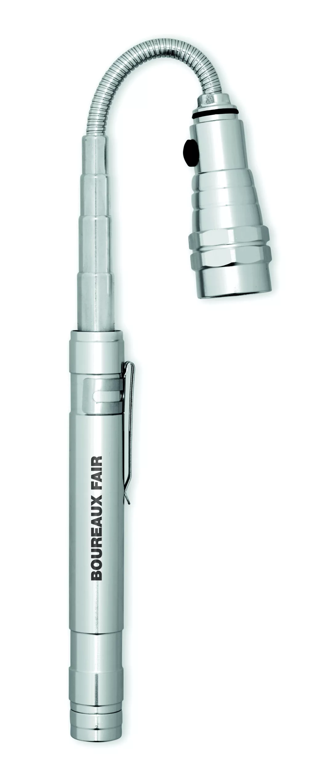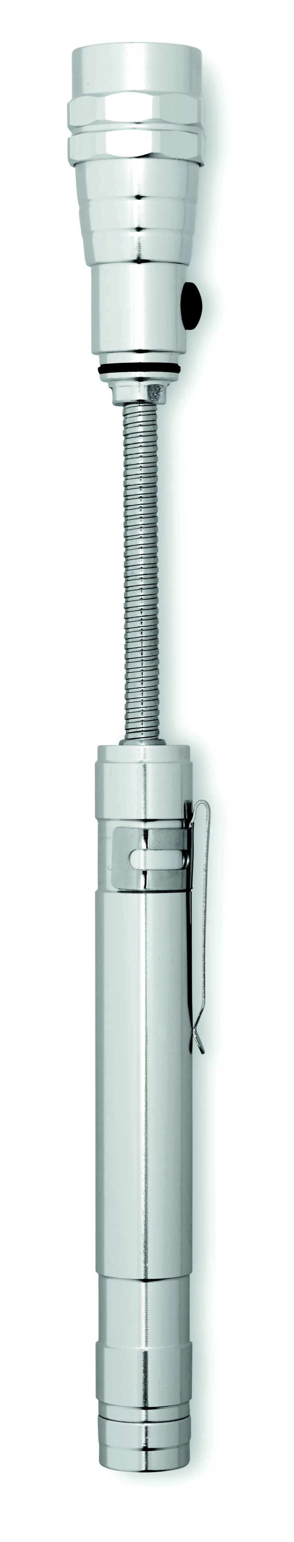 Kihúzható alumínium elemlámpa 3 LED izzóval, mágnessel a tetején és csíptetővel. Maximum hossz: 57 cm. A működéshez szükséges 4 db LR44 elemmel szállítjuk.