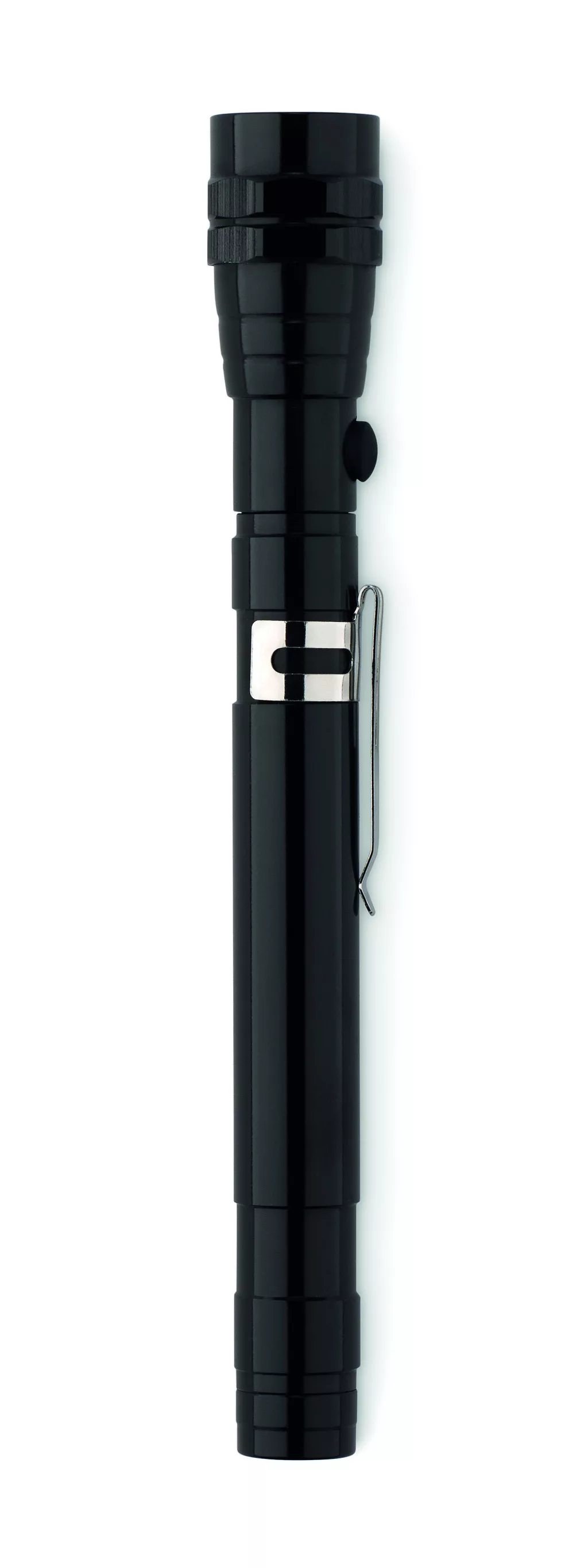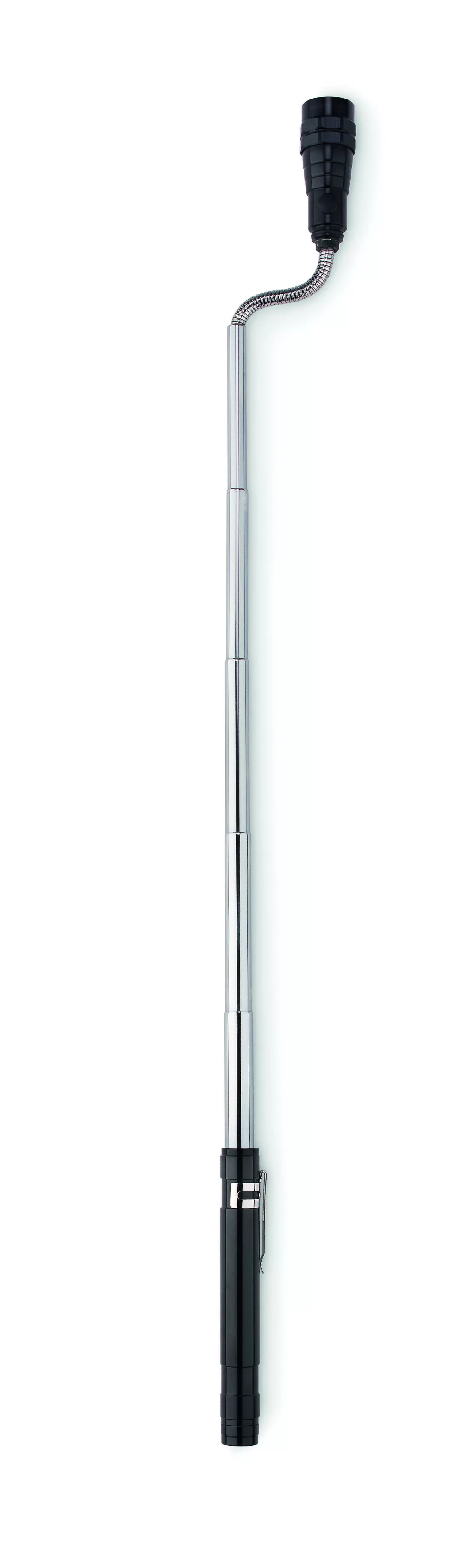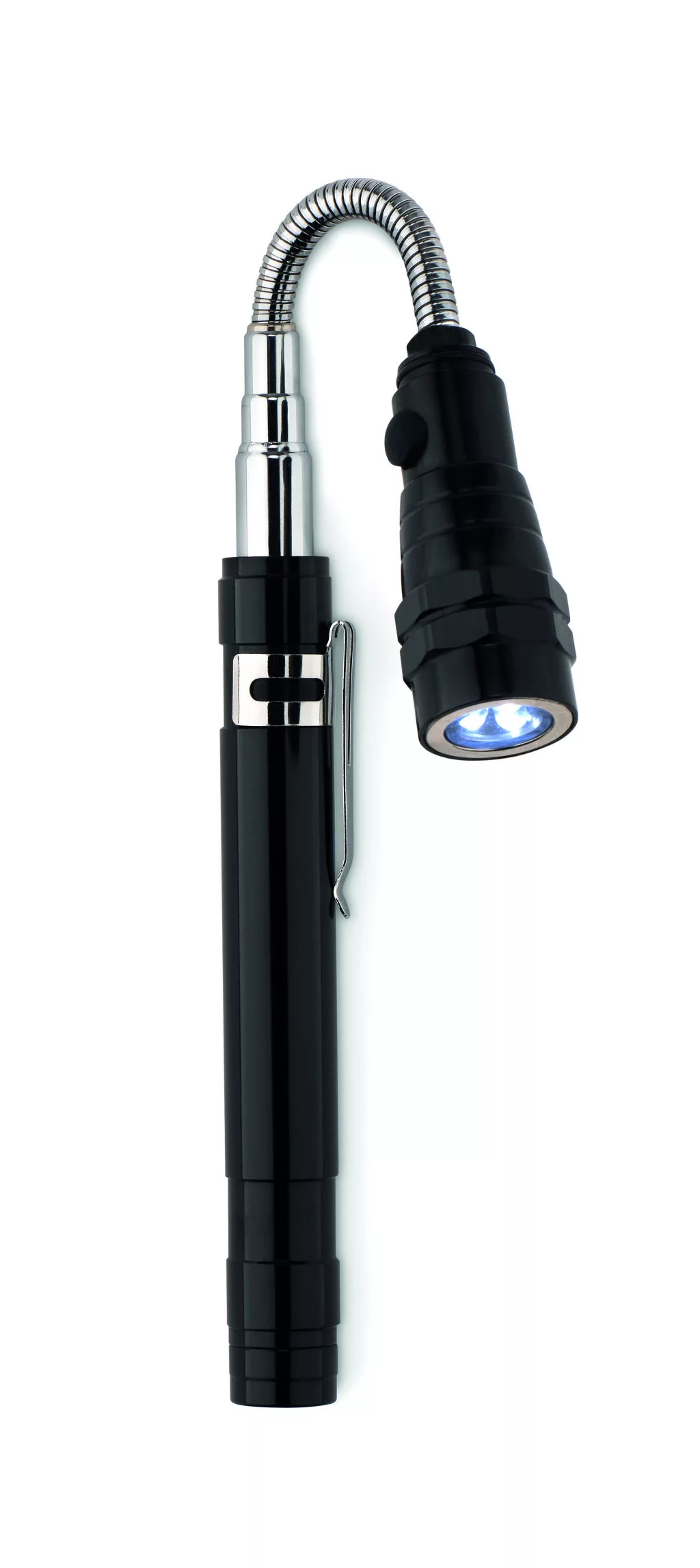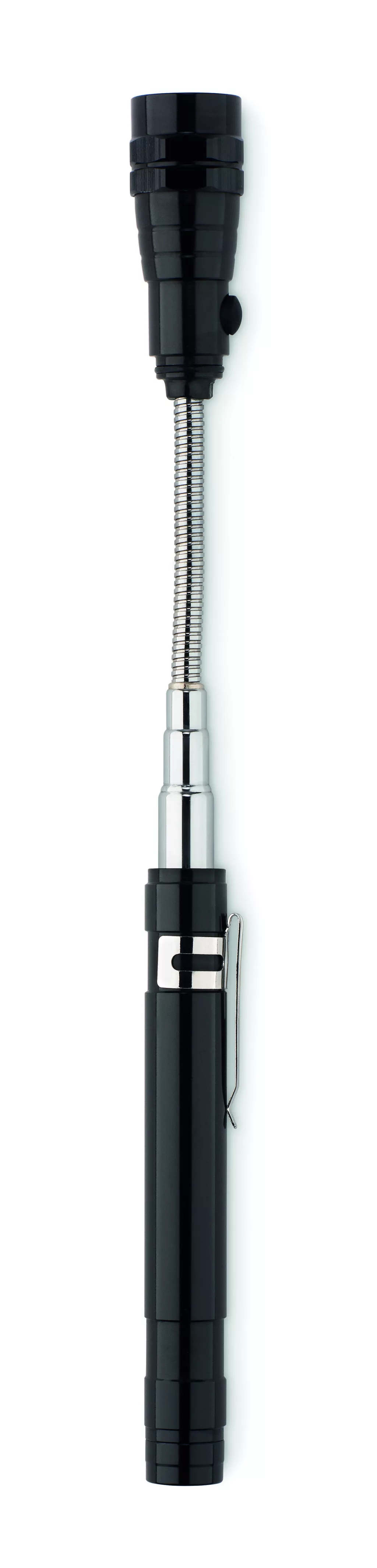 Kihúzható alumínium elemlámpa 3 LED izzóval, mágnessel a tetején és csíptetővel. Maximum hossz: 57 cm. A működéshez szükséges 4 db LR44 elemmel szállítjuk.