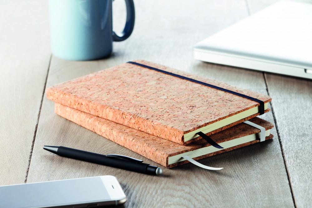 A5 jegyzetfüzet parafa keményfedeles borítóval. Cérnafűzött. 192 vonalas oldal (96 lap) újrahasznosított papírból. Elasztikus zárópánt és tolltartó hurok, könyvjelző szalag. A parafa 100%-ban természetes anyag. Szerkezeti jellege és felületi porozitása miatt az egyes tárgyak végső emblémázási eredménye eltéréseket mutathat.