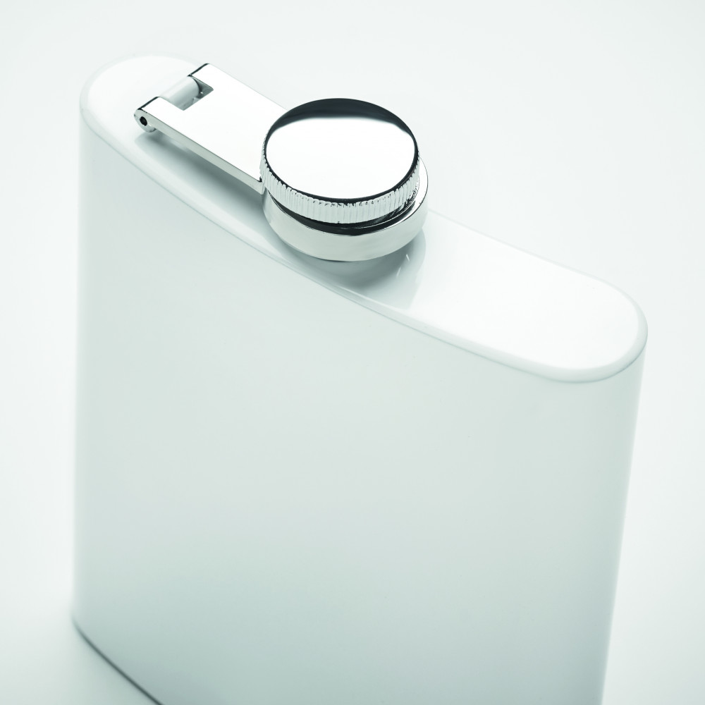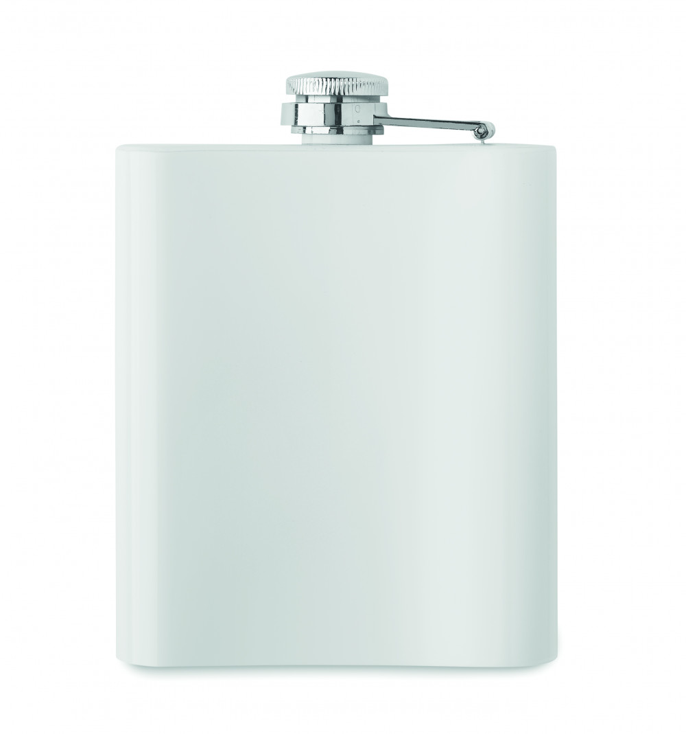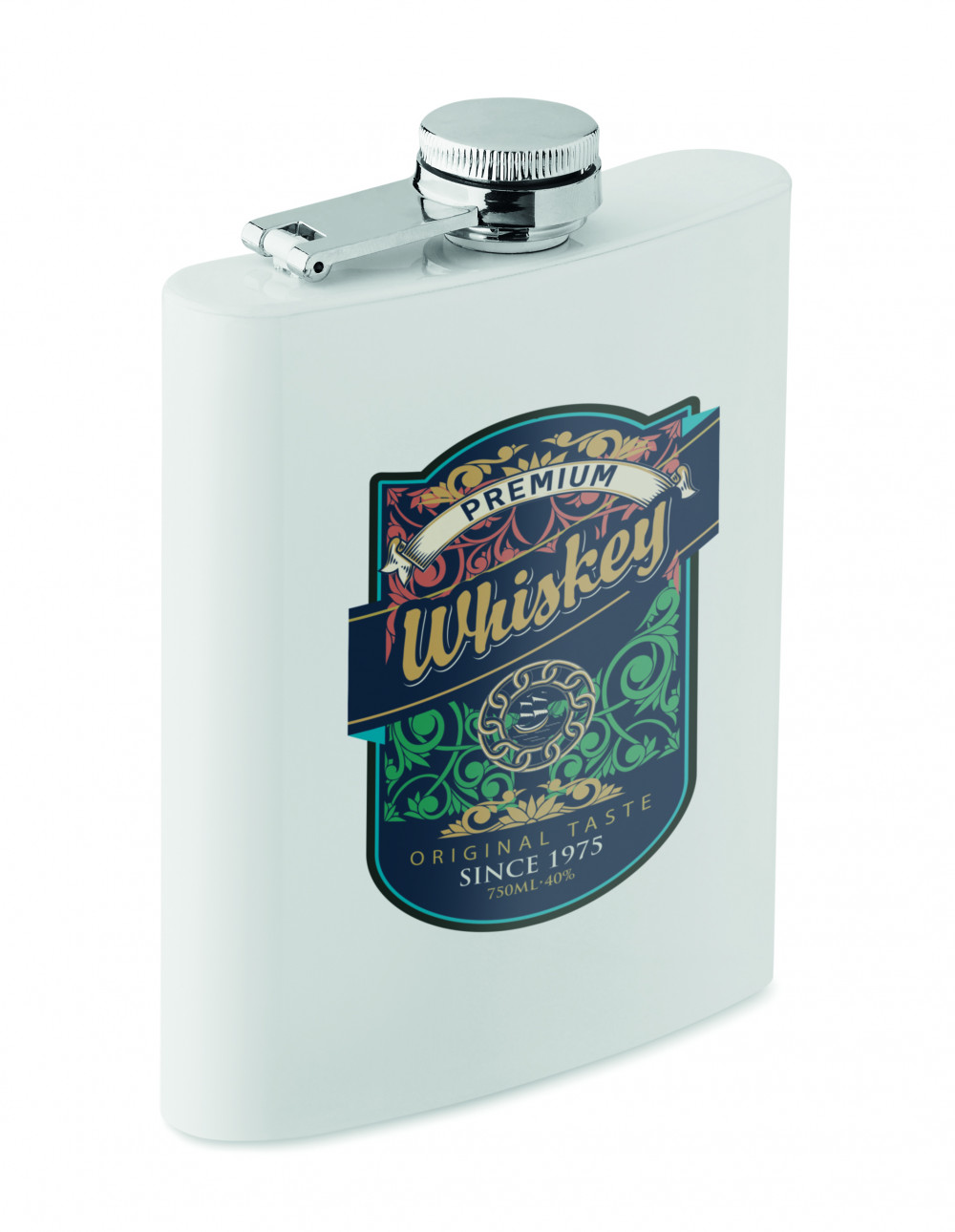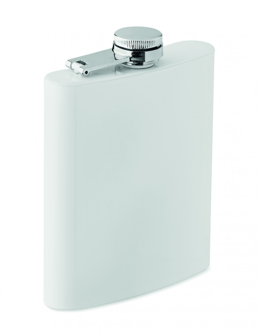 Szimplafalú laposüveg újrahasznosított rozsdamentes acélból (90% újrahasznosított rozsdamentes acél, 10% rozsdamentes acél), szublimációs nyomtatást lehetővé tévő bevonattal. Űrtartalom: 180 ml.
