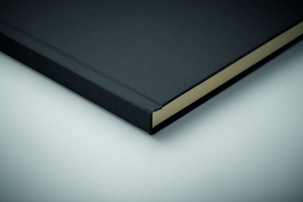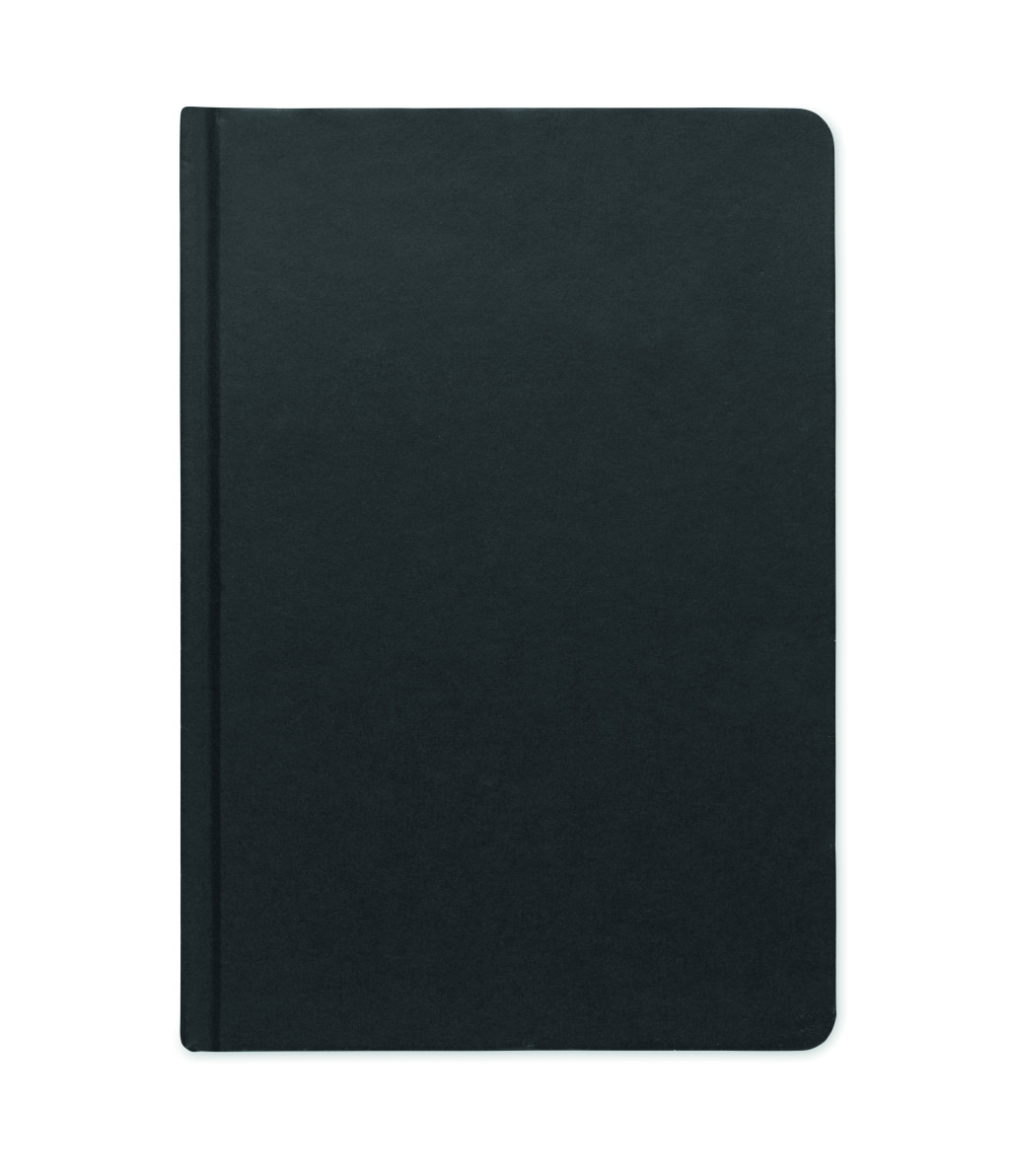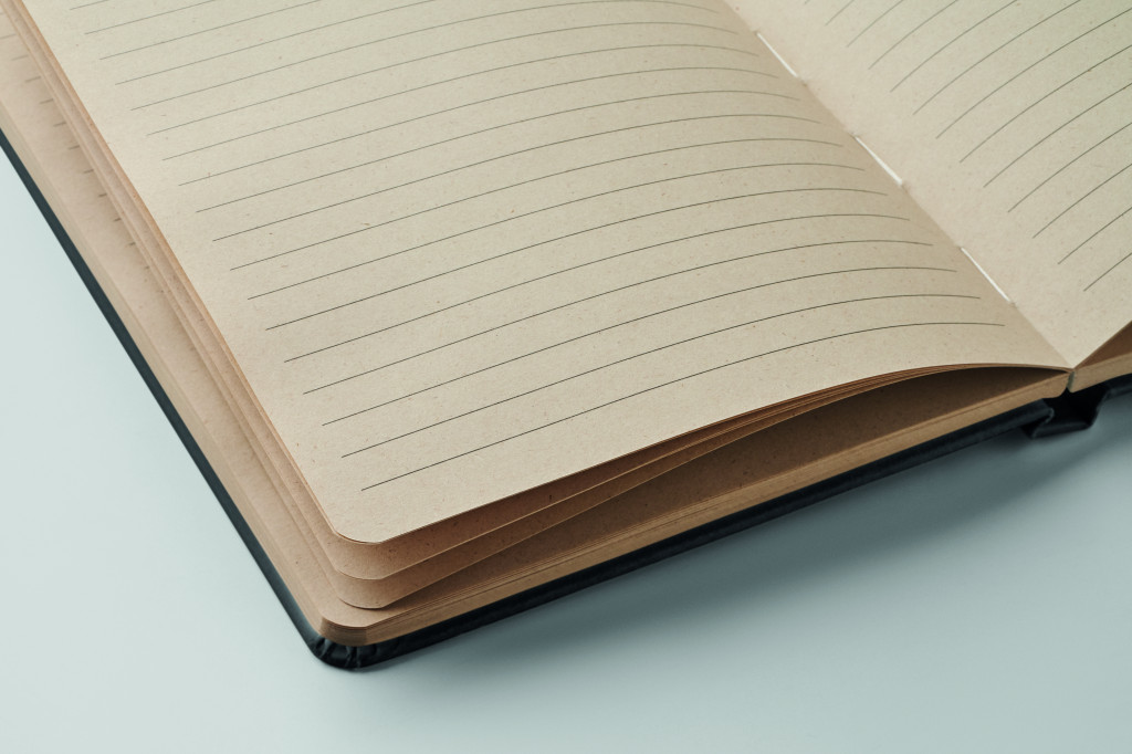 A5 jegyzetfüzet keménytáblás borítóval. 160 vonalas oldal (80 lap), cukornád PLA-ból (65% cukornádrost, 35% papír). Cérnafűzött.