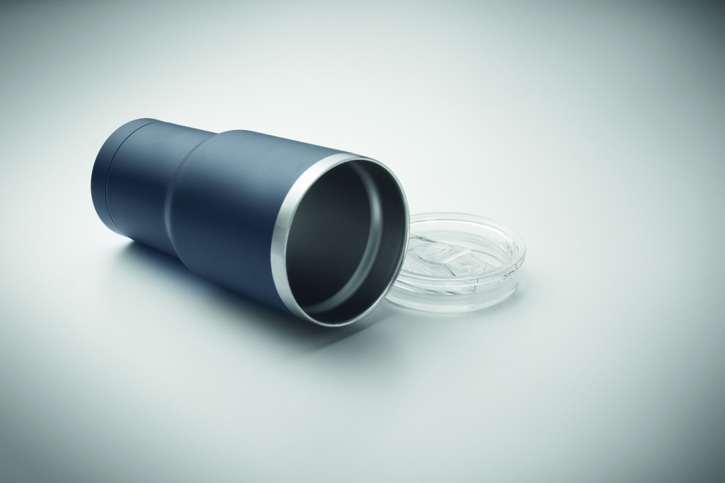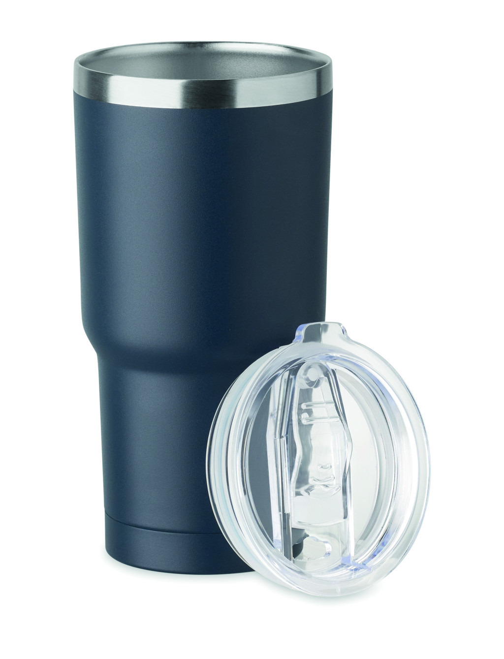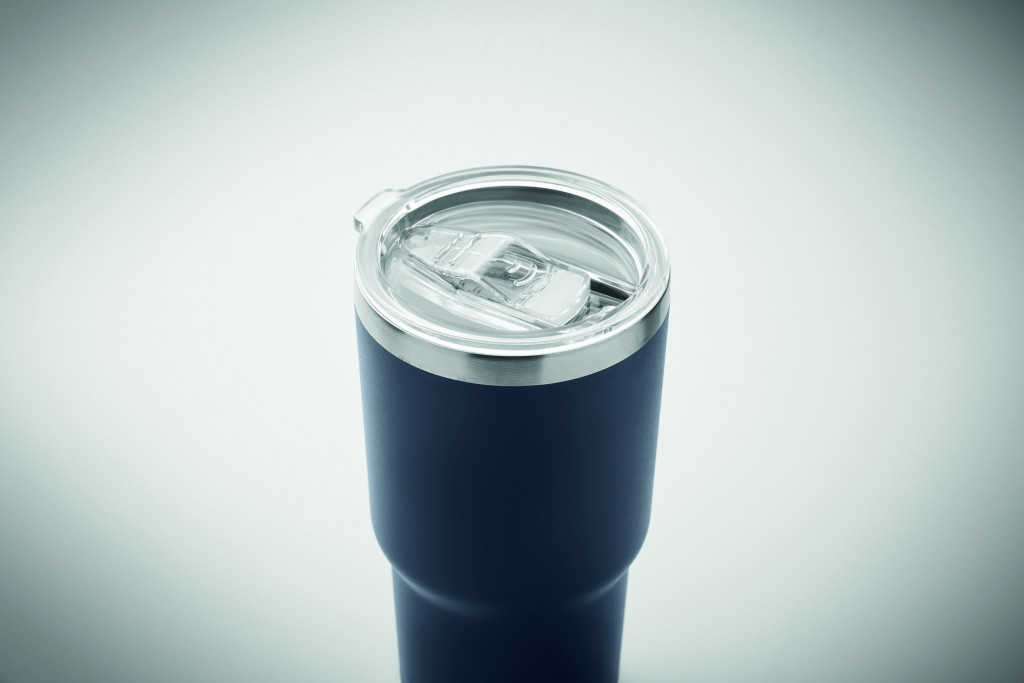 Duplafalú pohár újrahasznosított rozsdamentes acélból (90% újrahasznosított rozsdamentes acél és 10% rozsdamentes acél). Fedél csúsztatható ivónyílással. Szivárgásmentes. Űrtartalom: 550 ml.