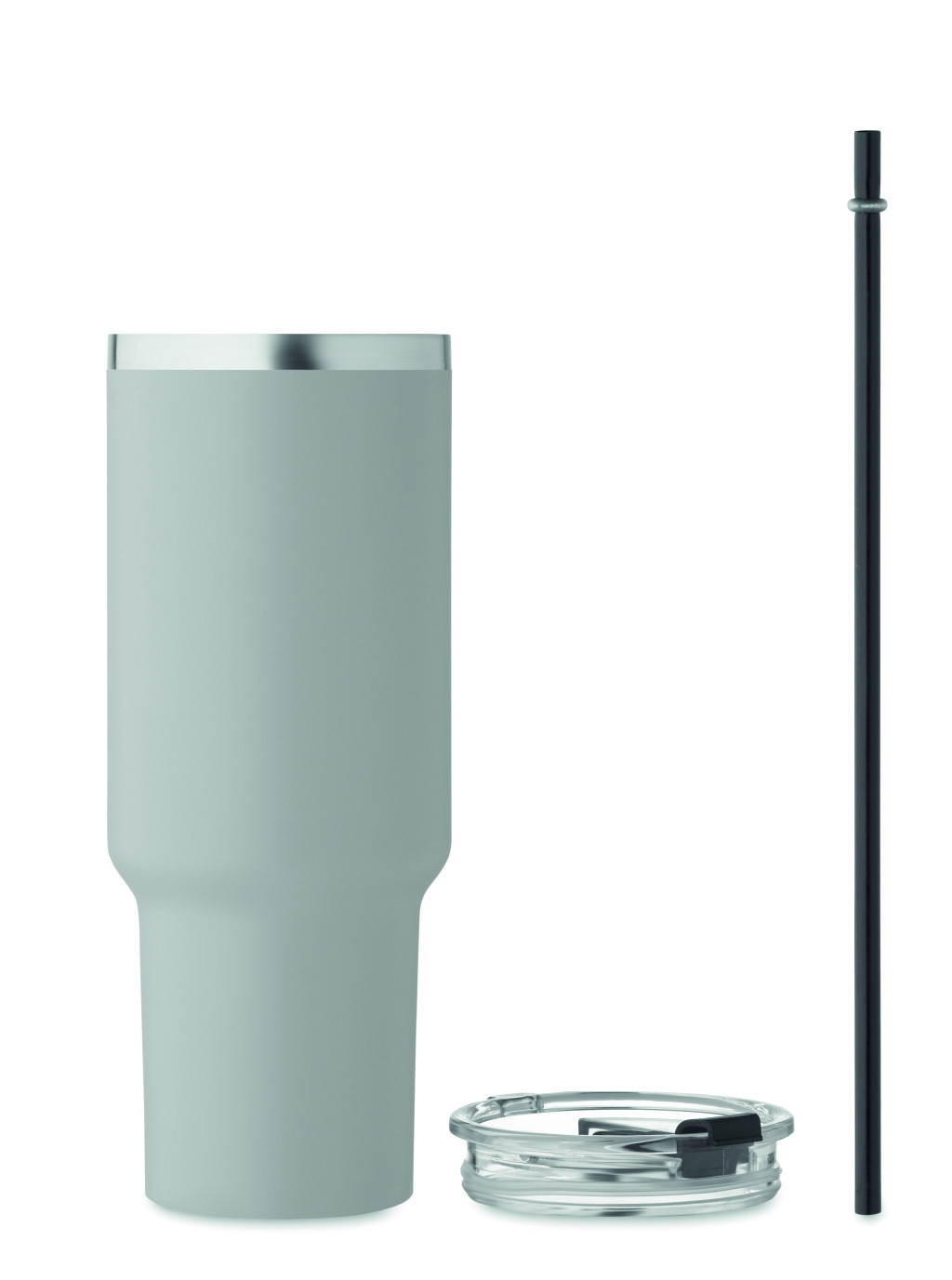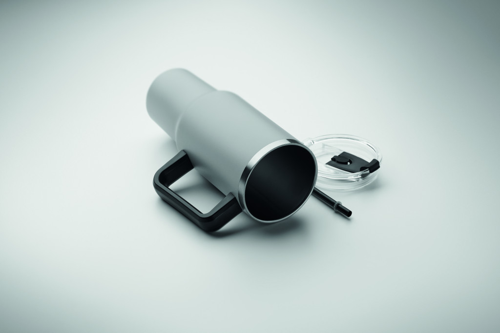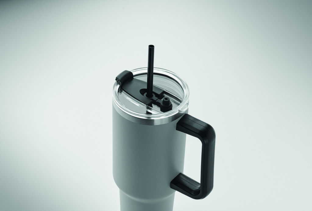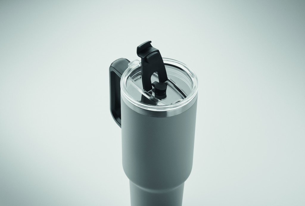 Duplafalú, újrahasznosított rozsdamentes acél pohár, beépített PE- szívószálas fedéllel. Űrtartalom 1200 ml. (90% újrahasznosított rozsdamentes acél és 10% rozsdamentes acél).