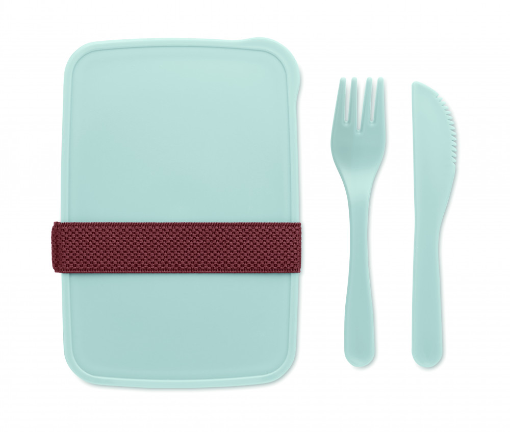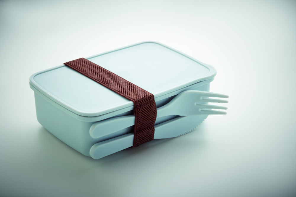1 rekeszes uzsonnásdoboz PP-ből, evőeszközökkel együtt.