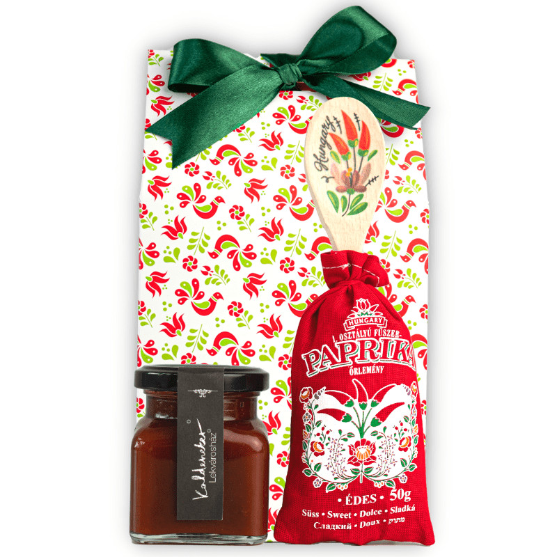 A csomag egyik különlegessége a magyar fűszerpaprika, amely a hagyományos ízeket és az otthon melegségét hozza el. Ez a csomag egy különleges kis fakanalat is rejt magában, hogy ajándékozottad azonnal belevethesse magát az magyaros ízek világába.