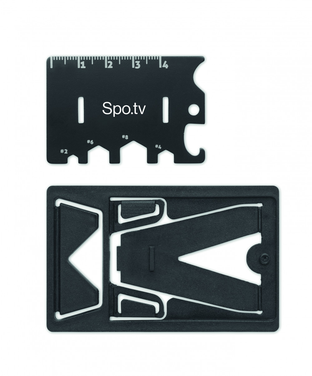 Multifunkciós szerszám rozsdamentes acélból és PP-ből, telefonállvány és 6 különböző szerszám funkcióval, PU tokban. Csavarhúzót, vonalzót, hatszögletű csavarkulcsot és üvegnyitót tartalmaz.