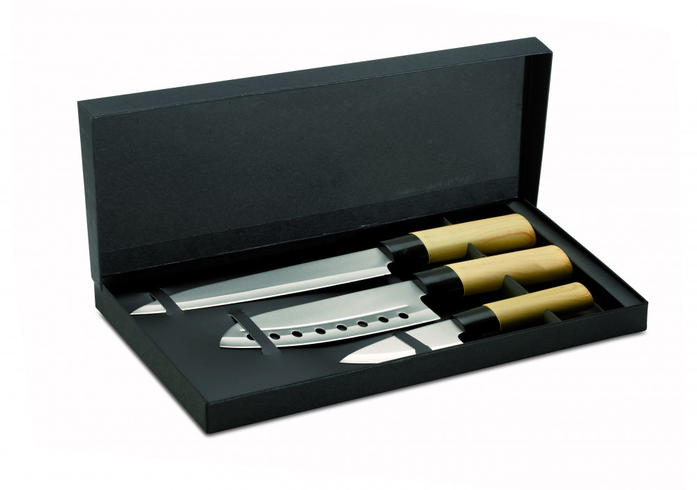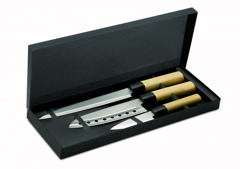 3 részes japán stílusú késkészlet papír ajándékdobozban. Rozsdamentes acél penge, PP műanyag nyél.