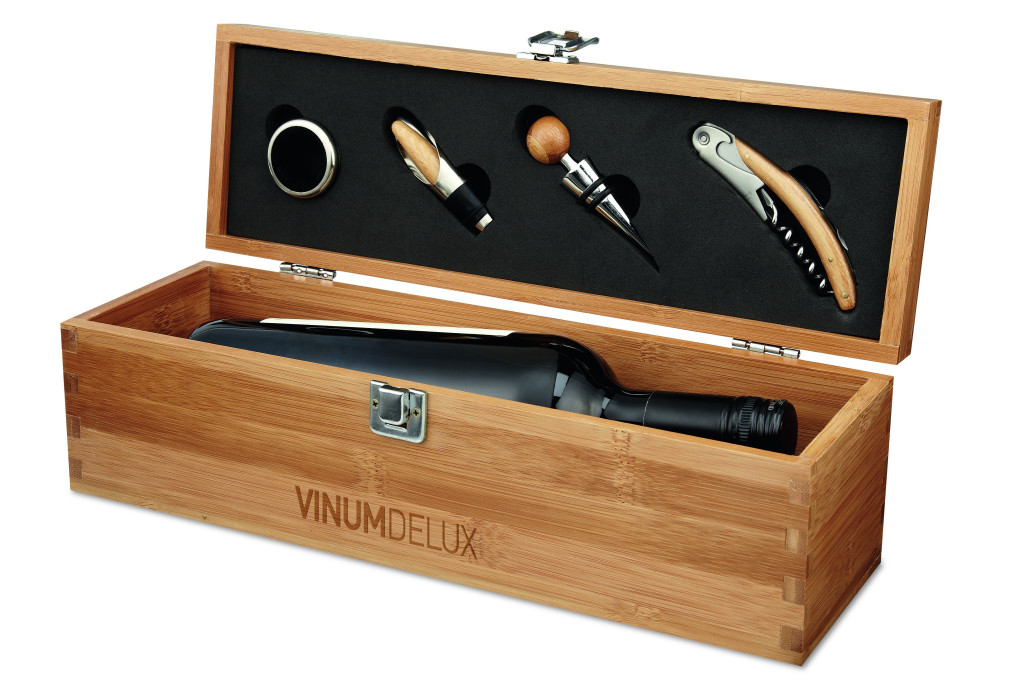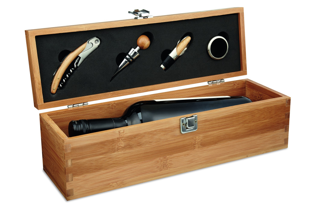 Bambusz ajándékdoboz boros kiegészítőkkel. Külön rész a boros palack számára. Bor nélkül szállítjuk. A bambusz természetes anyag, színében, mintázatában és méretében esetenként eltérő lehet.
