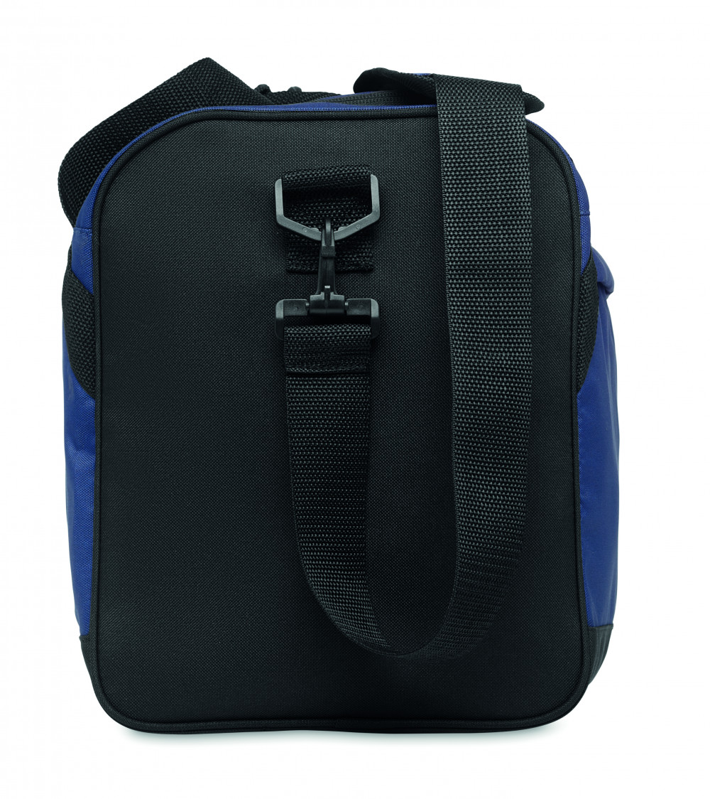 600D RPET sport- vagy utazótáska, nagy első cipzáras zsebbel, belső cipzáras zsebbel, állítható, lecsatolható vállpánttal.