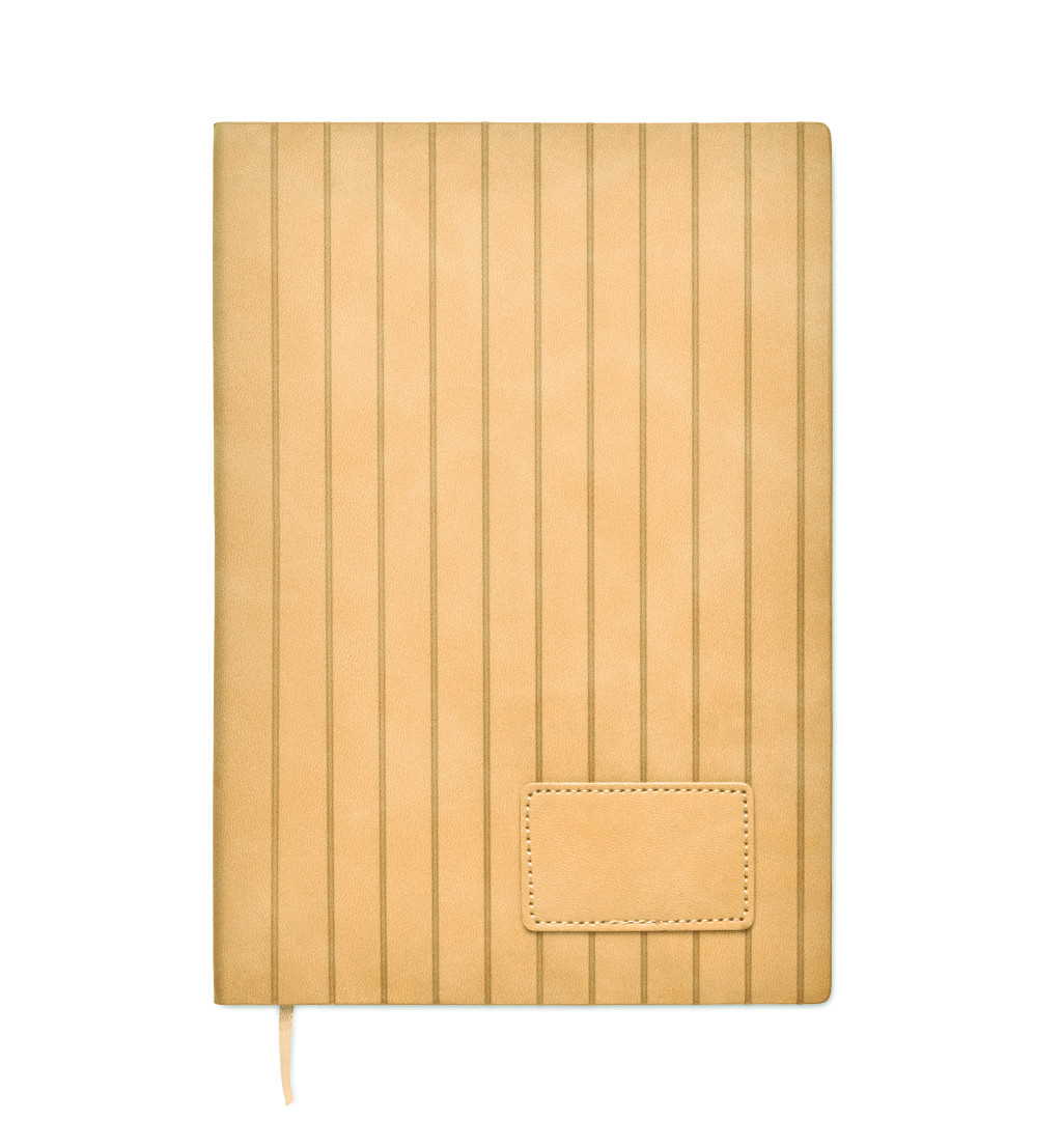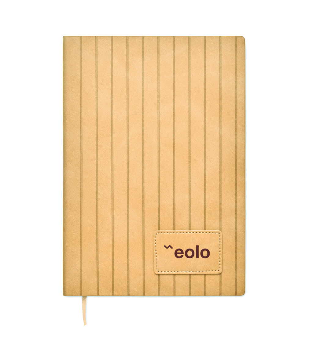 A5 jegyzetfüzet, füstös mintázatú, bordázott, 40% fogyasztás utáni újrahasznosított PU és 60% PU, puhafedeles borítóval, sima PU emblémázható címkével. 160 vonalas oldal (80 lap), 70 g/m² újrahasznosított papírból. Illeszkedő színű, poliészter könyvjelző szalag.
