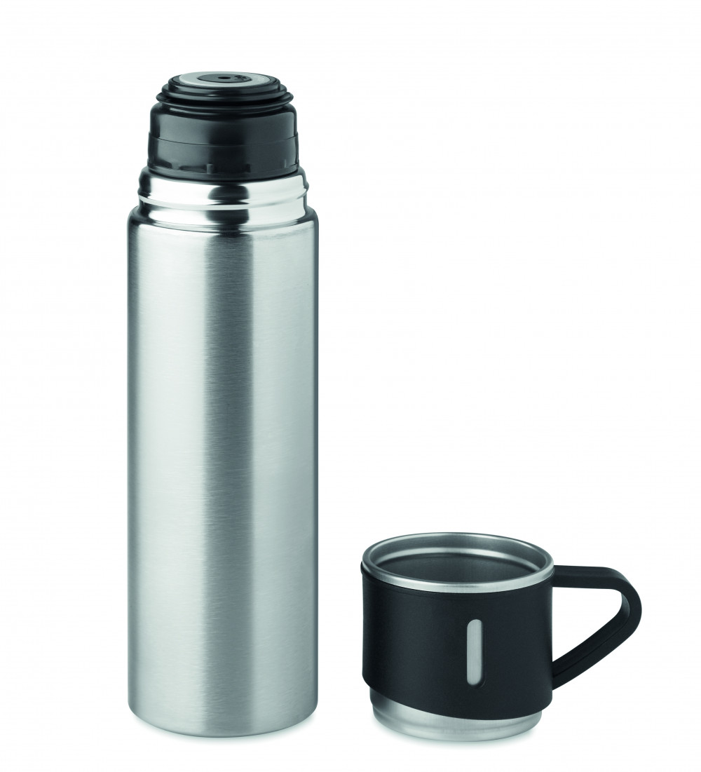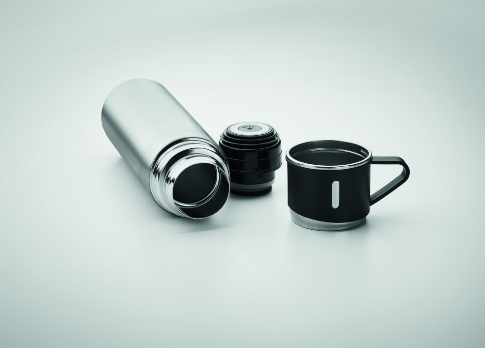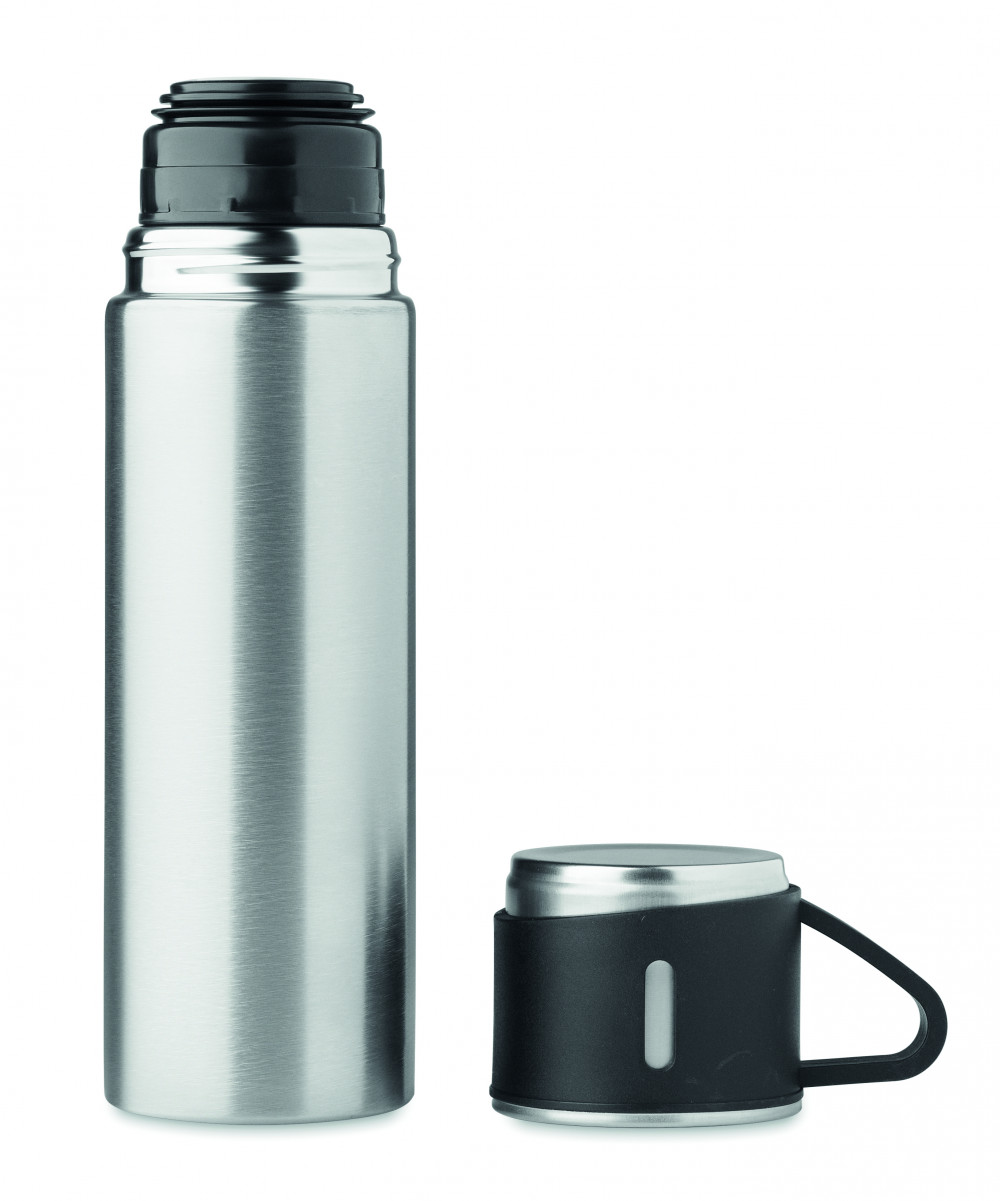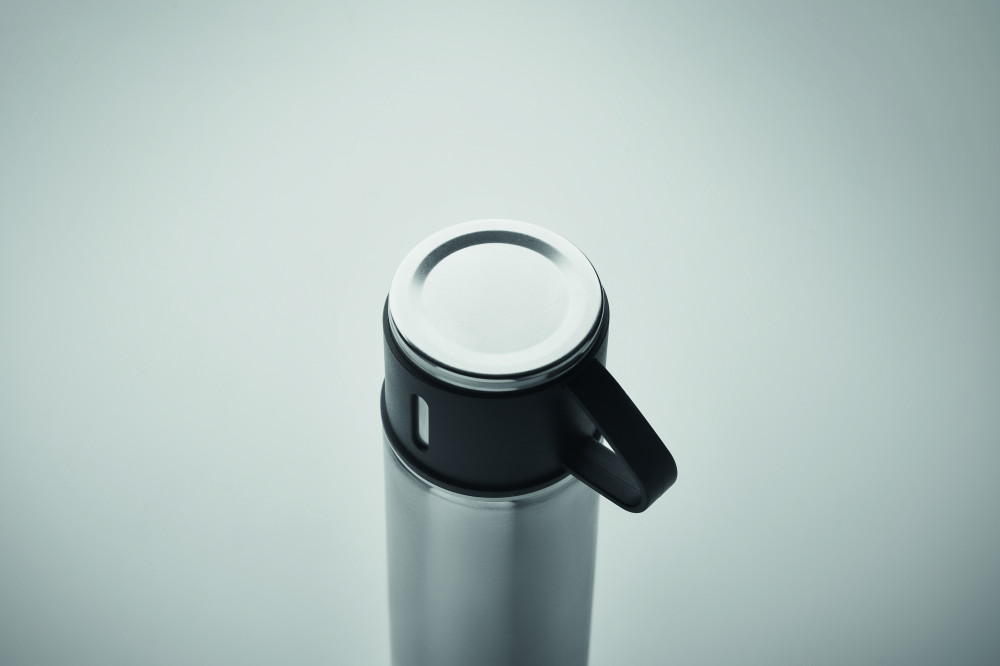 Duplafalú, rozsdamentes acél termoszpalack szivárgásmentes, bögre kupakkal. Űrtartalom: termoszpalack 420 ml, bögre 150 ml.