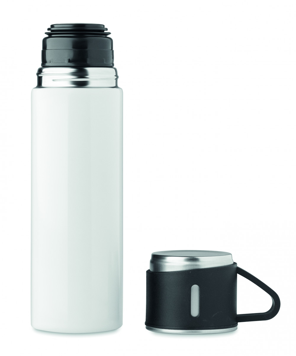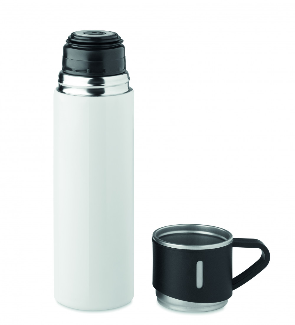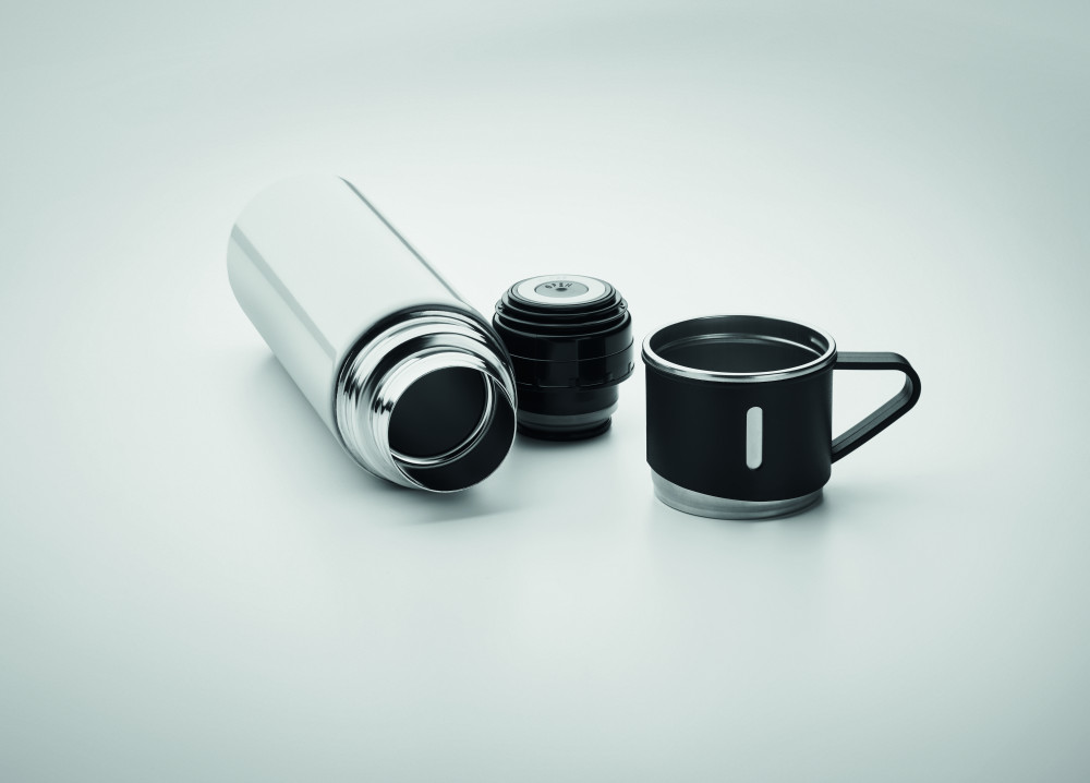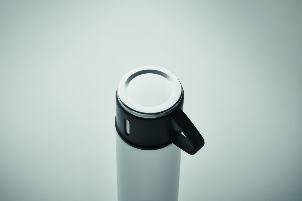 Duplafalú, rozsdamentes acél termoszpalack szivárgásmentes, bögre kupakkal. Űrtartalom: termoszpalack 420 ml, bögre 150 ml.