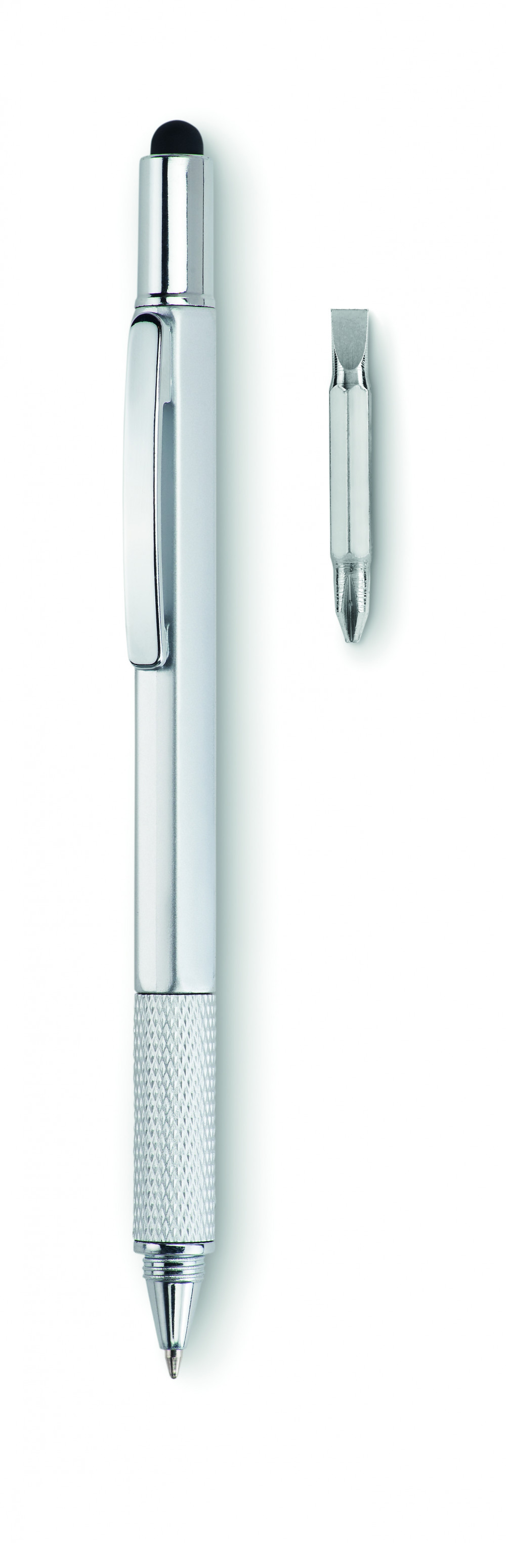 Csavarmechanikás ABS toll vízmértékkel, vonalzóval és érintőheggyel. Feketén író betéttel.