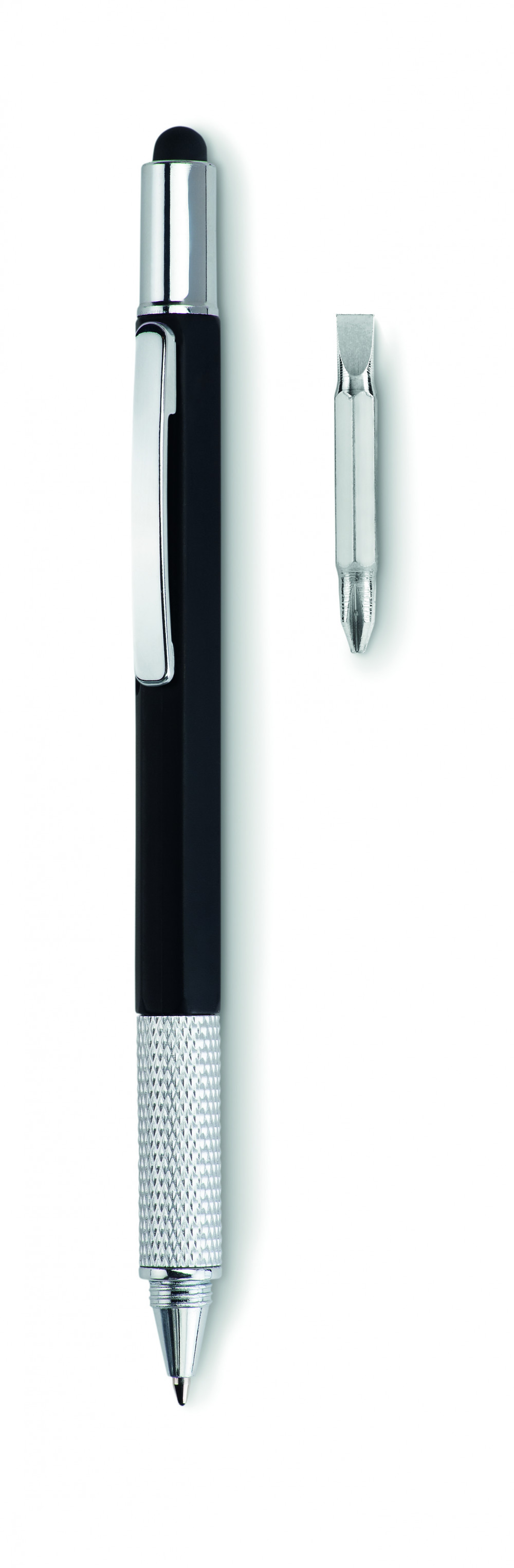Csavarmechanikás ABS toll vízmértékkel, vonalzóval és érintőheggyel. Feketén író betéttel.
