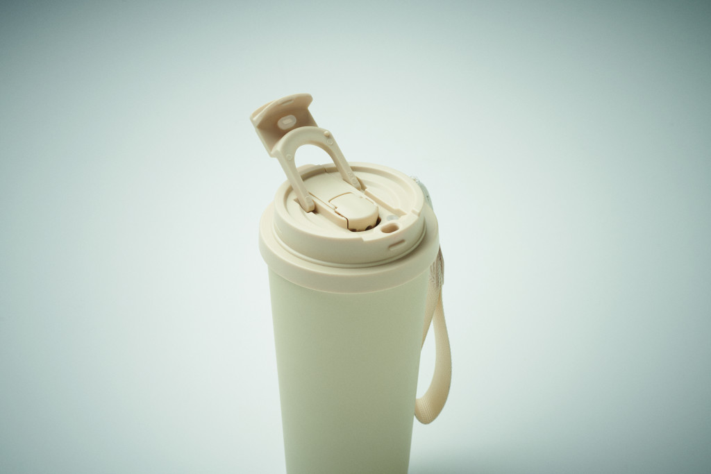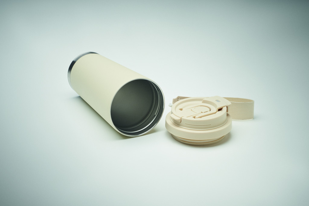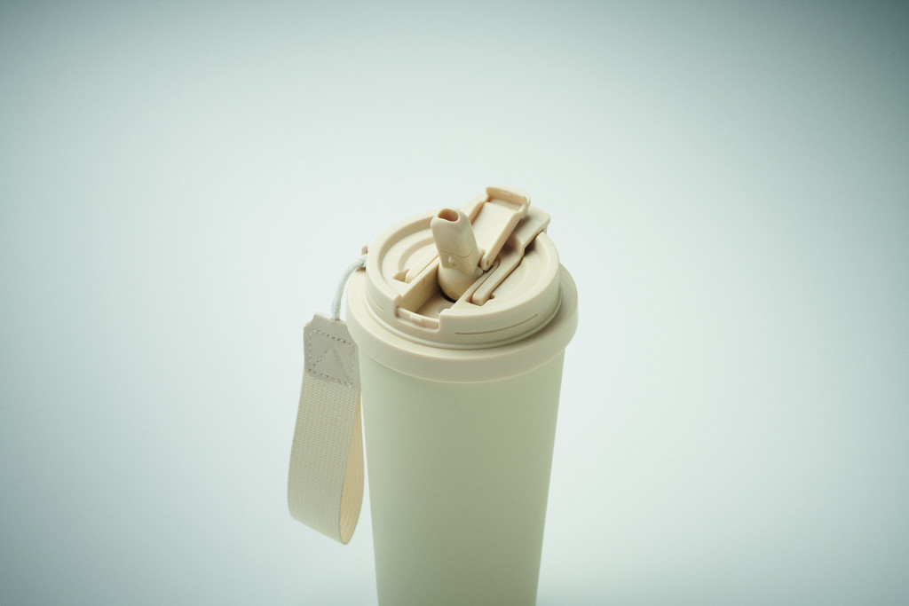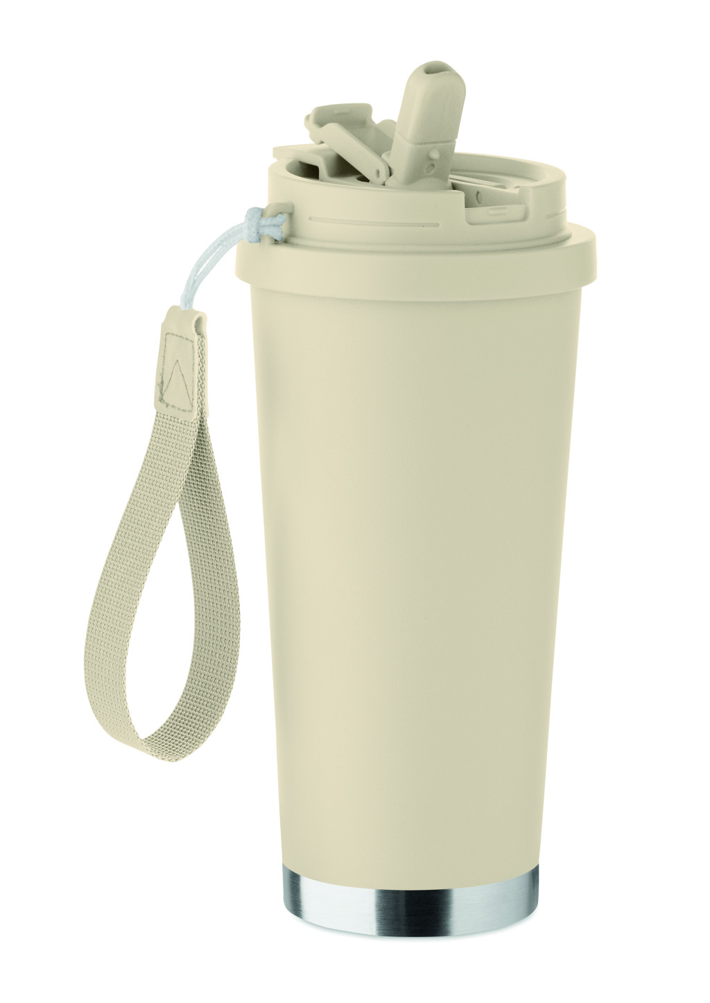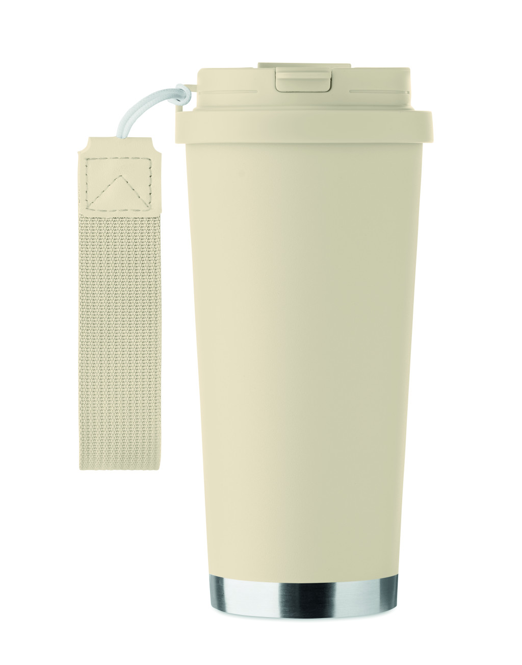 Duplafalú, újrahasznosított rozsdamentes acél (90% újrahasznosított rozsdamentes acél és 10% rozsdamentes acél) pohár, PP fedéllel (2 az 1-ben ivónyílással és szívószálas fedéllel) és RPET hordszíjjal. Szivárgásmentes. Űrtartalom: 500 ml.