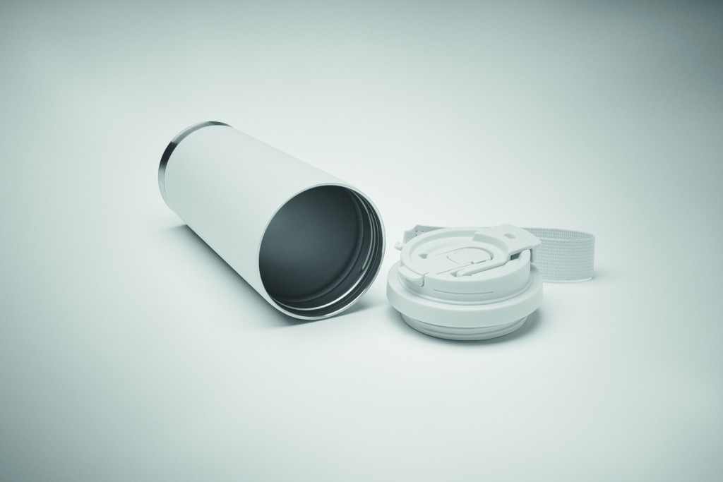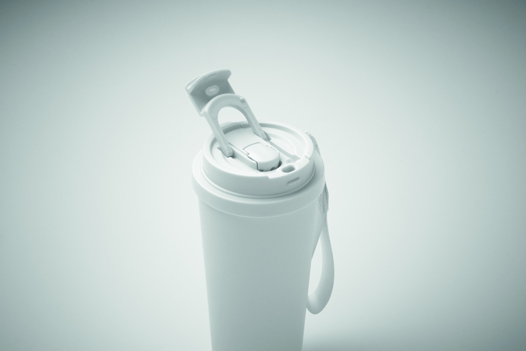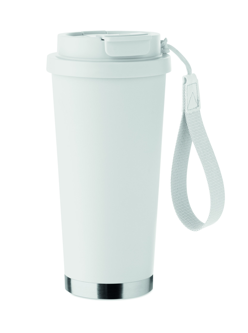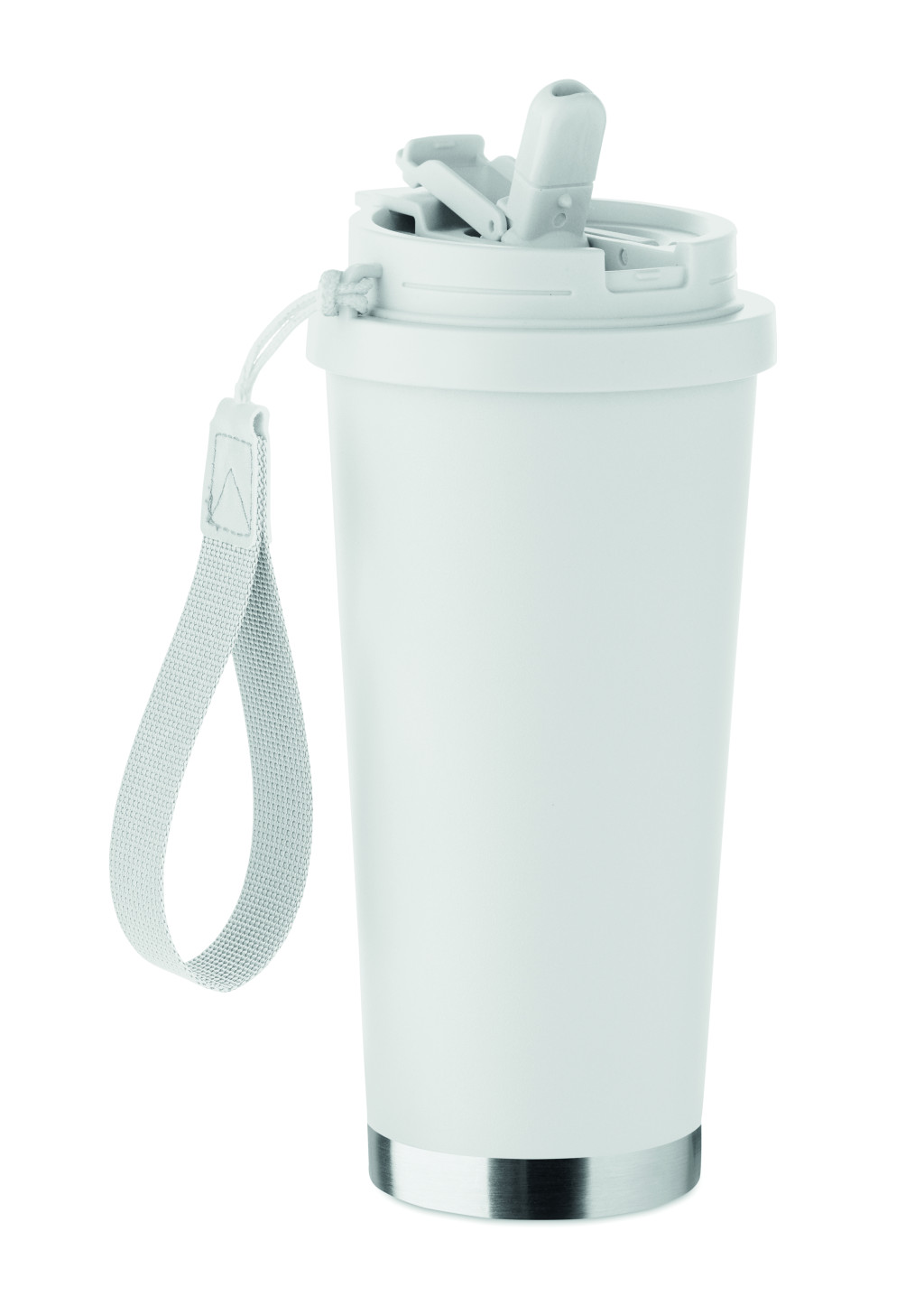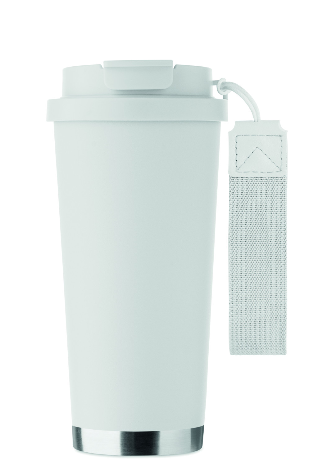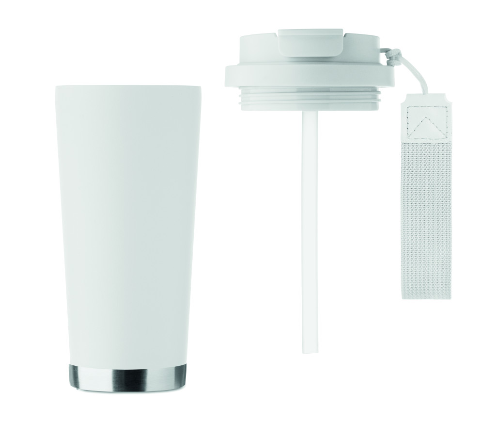 Duplafalú, újrahasznosított rozsdamentes acél (90% újrahasznosított rozsdamentes acél és 10% rozsdamentes acél) pohár, PP fedéllel (2 az 1-ben ivónyílással és szívószálas fedéllel) és RPET hordszíjjal. Szivárgásmentes. Űrtartalom: 500 ml.