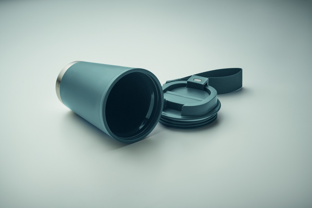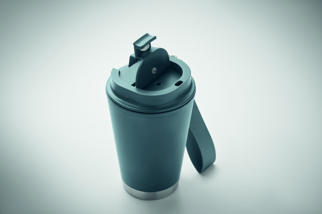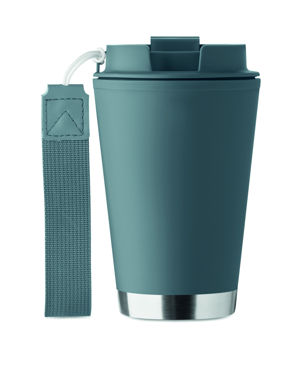 Duplafalú pohár PP belső- és újrahasznosított PP külső fallal, újrahasznosított rozsdamentes acél részlettel az alján, RPET csuklópánttal. Űrtartalom: 300 ml.