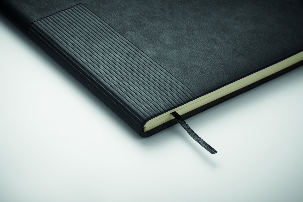 A5 jegyzetfüzet PU puhafedeles borítóval. Cérnafűzött. 160 vonalas oldal (80 lap), újrahasznosított papírból. Illeszkedő színű elasztikus zárópánt és könyvjelző szalag. Fém részlet az elülső oldalon.