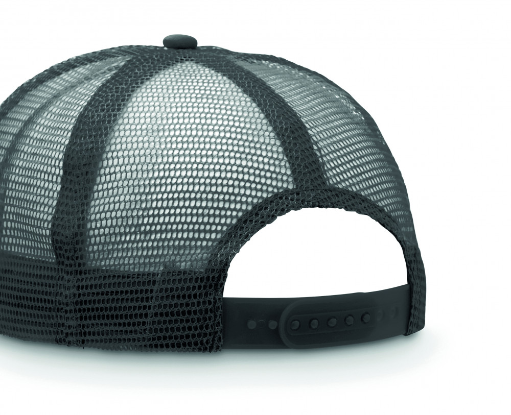 5 paneles poliészter 140-150 gr/m2 kamionos sapka. Állítható műanyag zárórész. Fehér elülső panel és színes napellenző jersey poliészter anyagból. A többi panel hálós anyagból. Méret: 7 1/4.