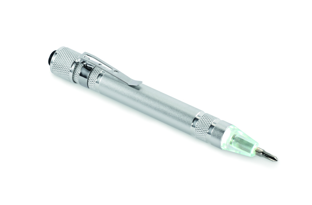 Golyóstoll alakú, újrahasznosított alumínium multifunkciós szerszám zseblámpával. 3 lapos és 3 csillag csavarhúzófejjel. A működéshez szükséges 4 db LR41 gombelemmel szállítjuk.