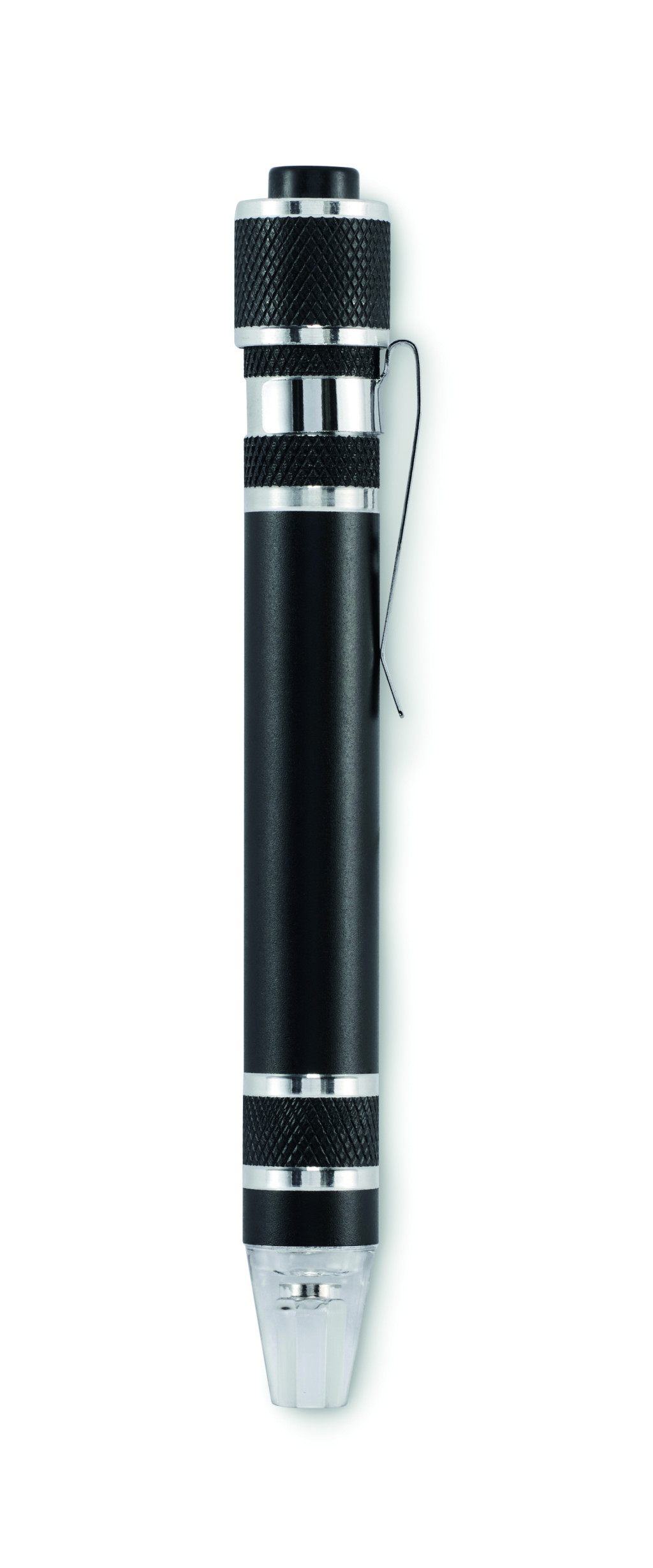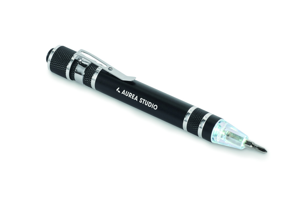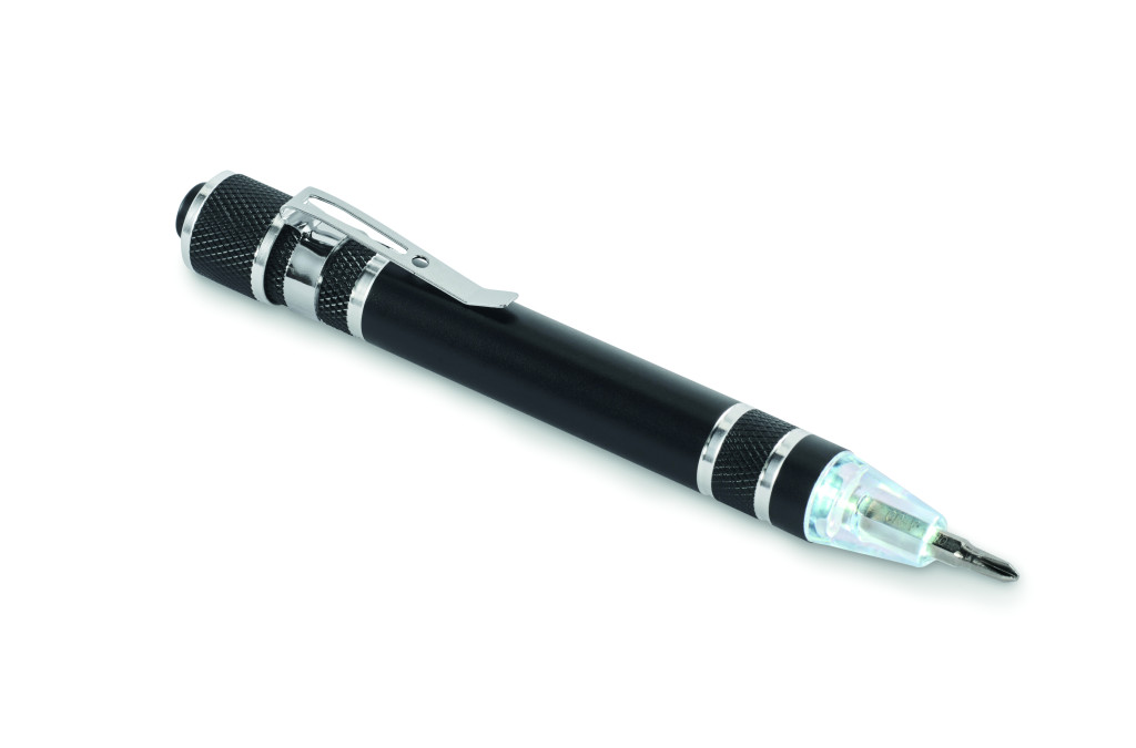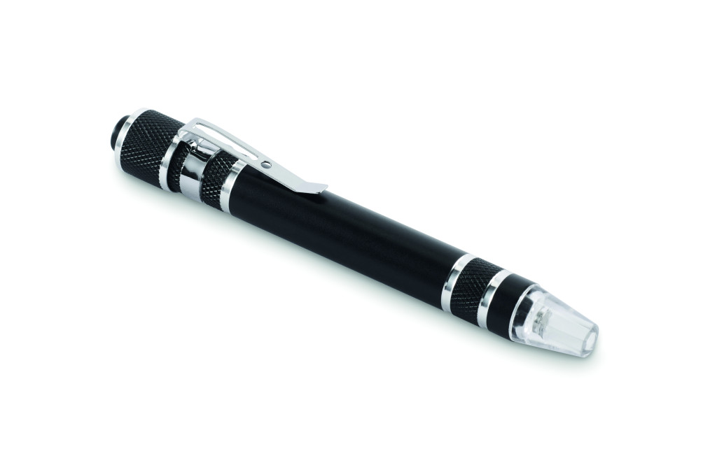 Golyóstoll alakú, újrahasznosított alumínium multifunkciós szerszám zseblámpával. 3 lapos és 3 csillag csavarhúzófejjel. A működéshez szükséges 4 db LR41 gombelemmel szállítjuk.
