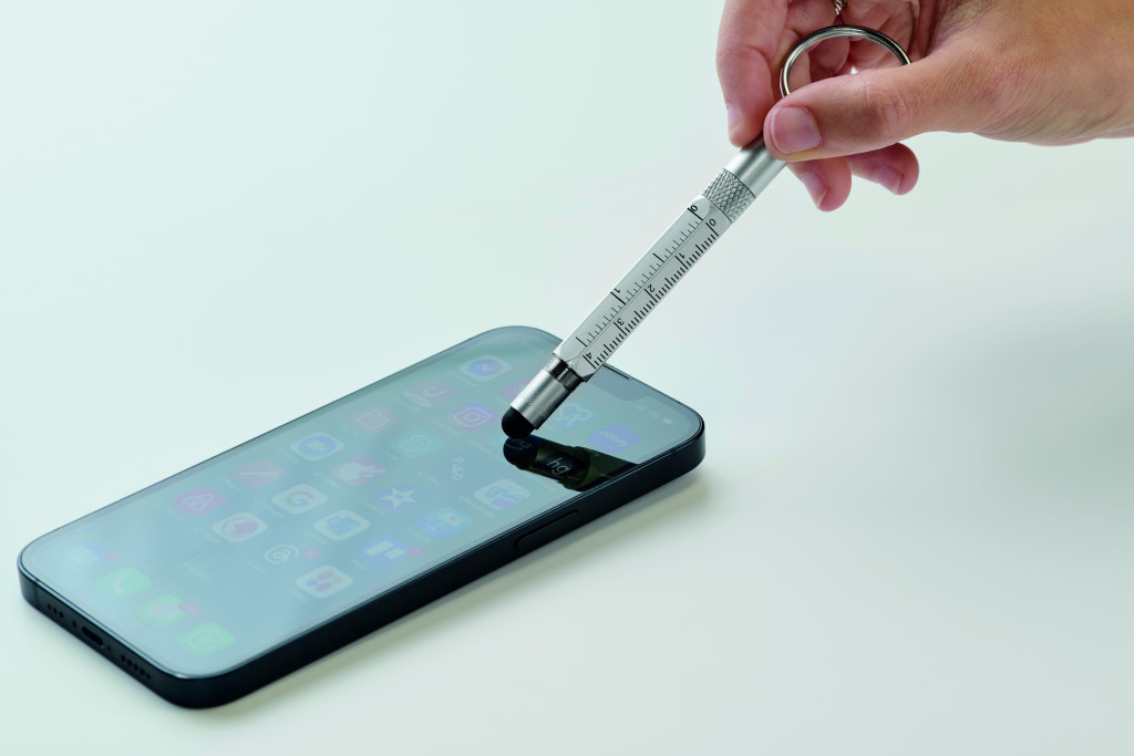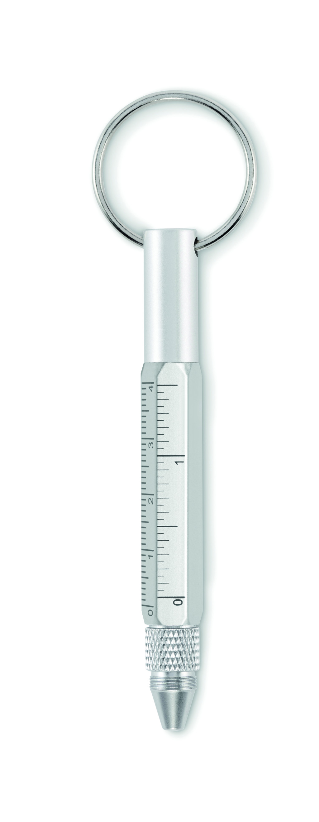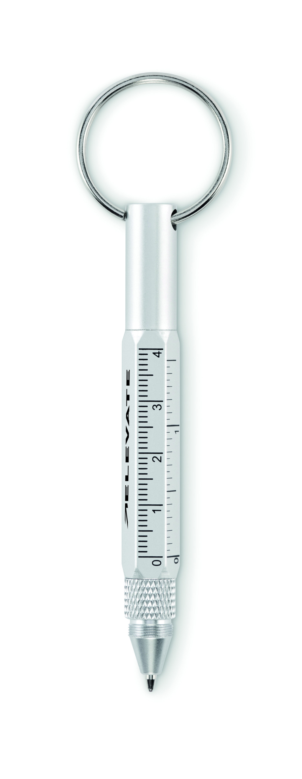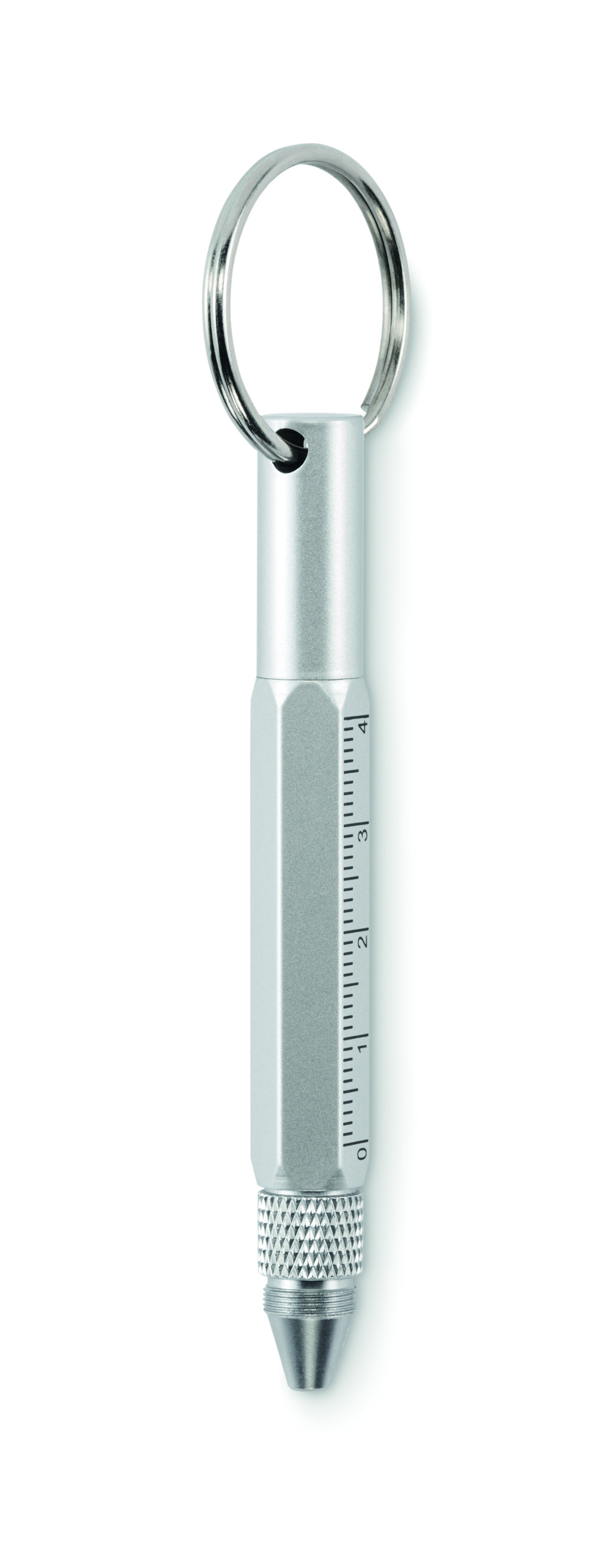 Kulcstartó csavarzáras golyóstollal újrahasznosított alumíniumból, 4 cm-es és 1 ,5 colos mini vonalzóval, érintőheggyel és 2 az 1-ben lapos- és csillag csavarhúzóval. Feketén író betéttel.