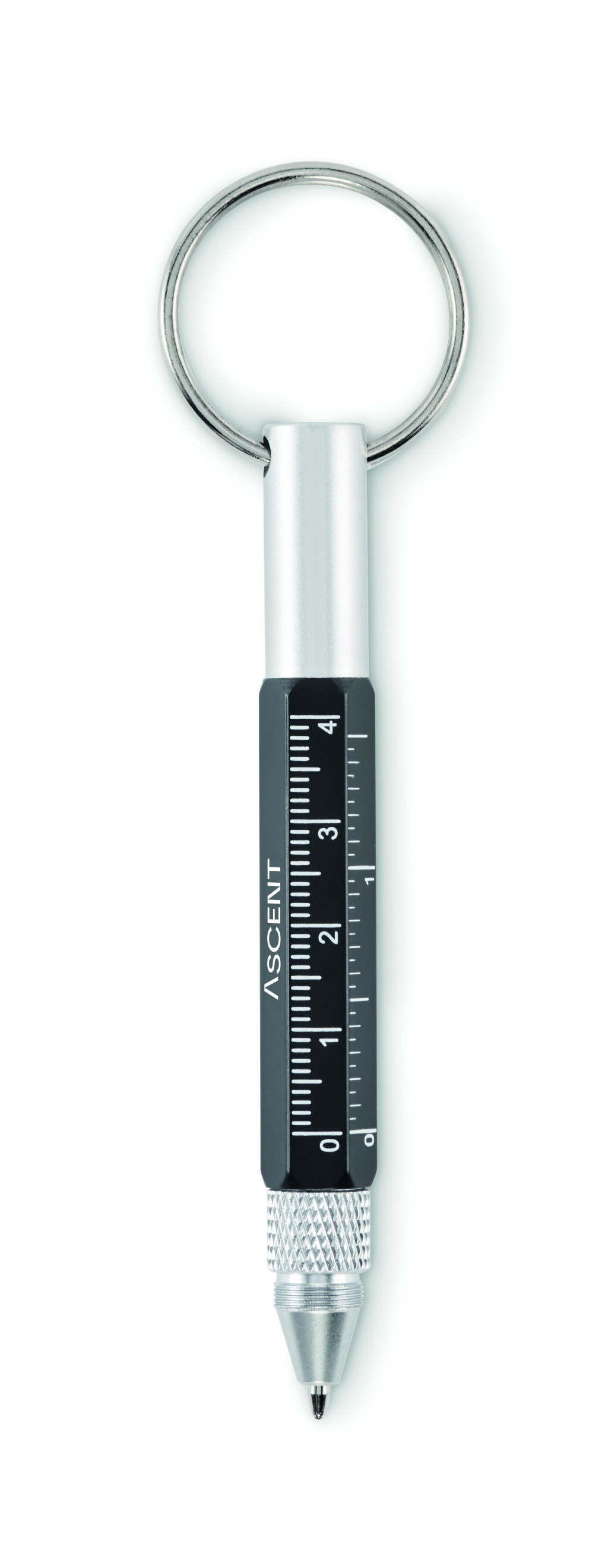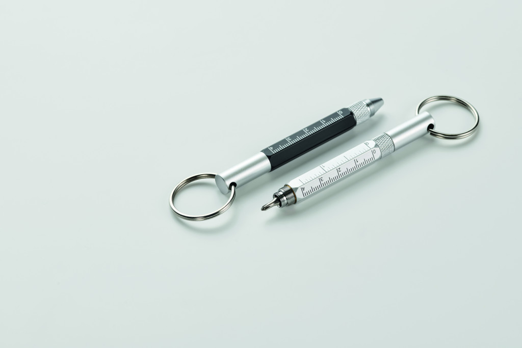 Kulcstartó csavarzáras golyóstollal újrahasznosított alumíniumból, 4 cm-es és 1 ,5 colos mini vonalzóval, érintőheggyel és 2 az 1-ben lapos- és csillag csavarhúzóval. Feketén író betéttel.