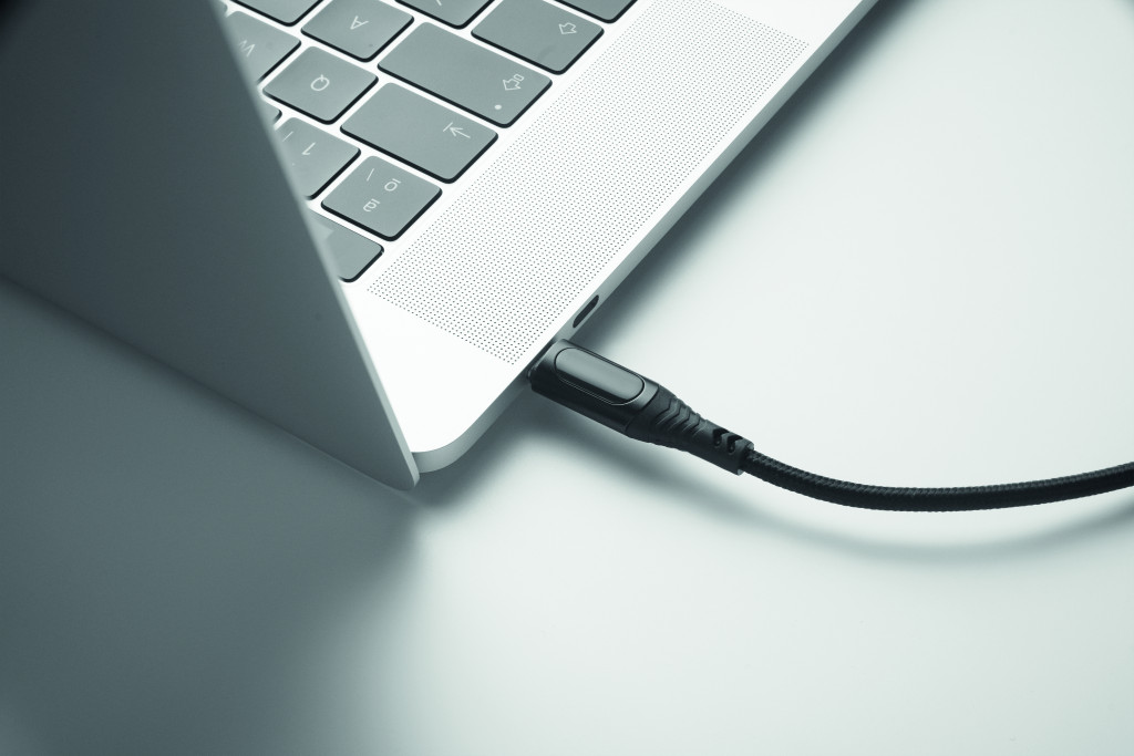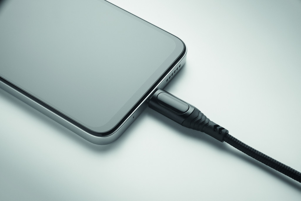 Akár 100 W-os töltésre és adatátvitelre alkalmas kábel, C-típusból C-típusba csatlakozóval, LED-es töltési teljesítmény kijelzővel. Kábel hossza 1 m.
