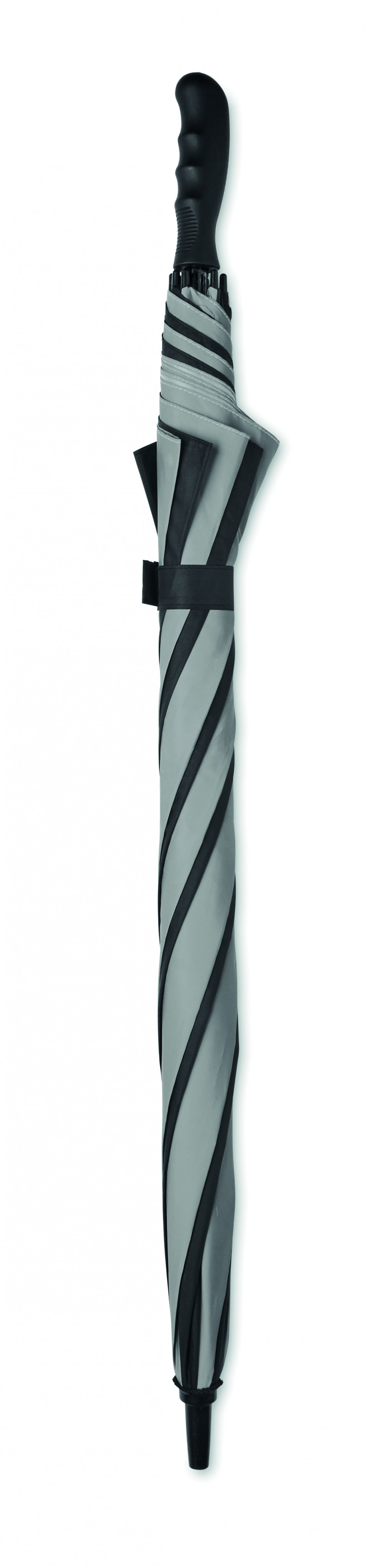 30 colos, manuális nyitású és záródású, szélálló esernyő 4 panelen 190T nyersselyemből és 4 panelen fényvisszaverő anyagból, üvegszálas vázzal, bordákkal és rúddal. Egyenes ABS markolat gumiborítással.