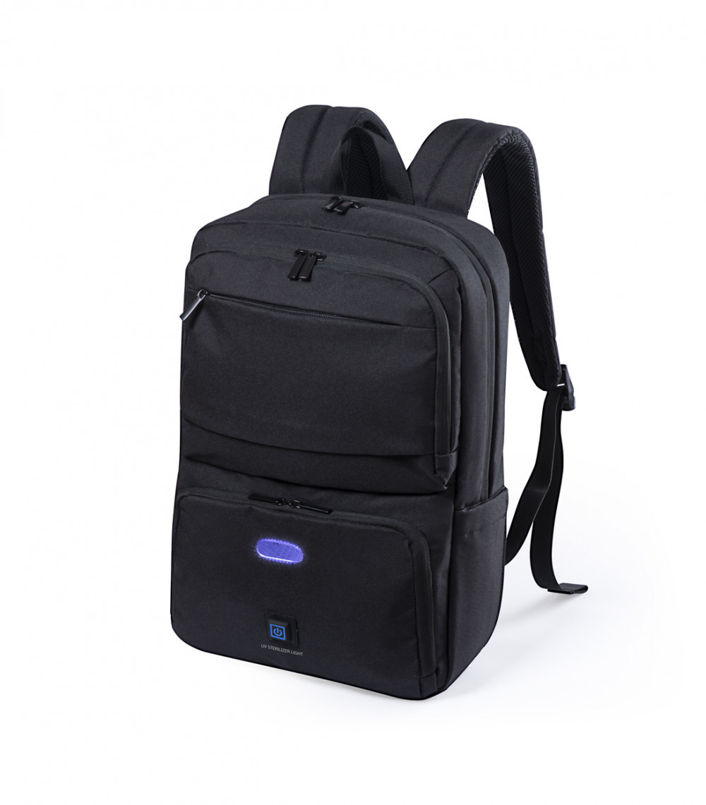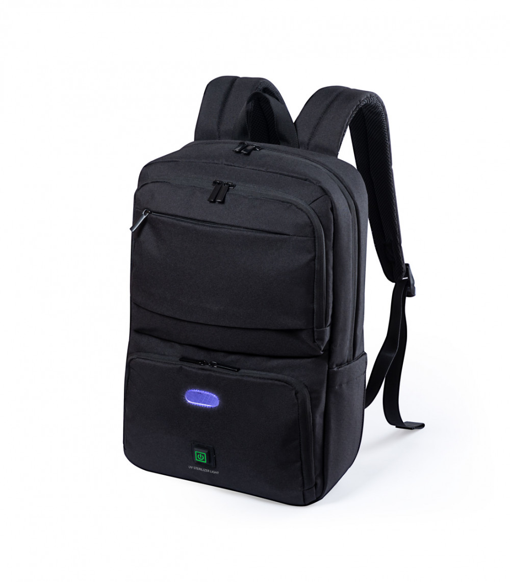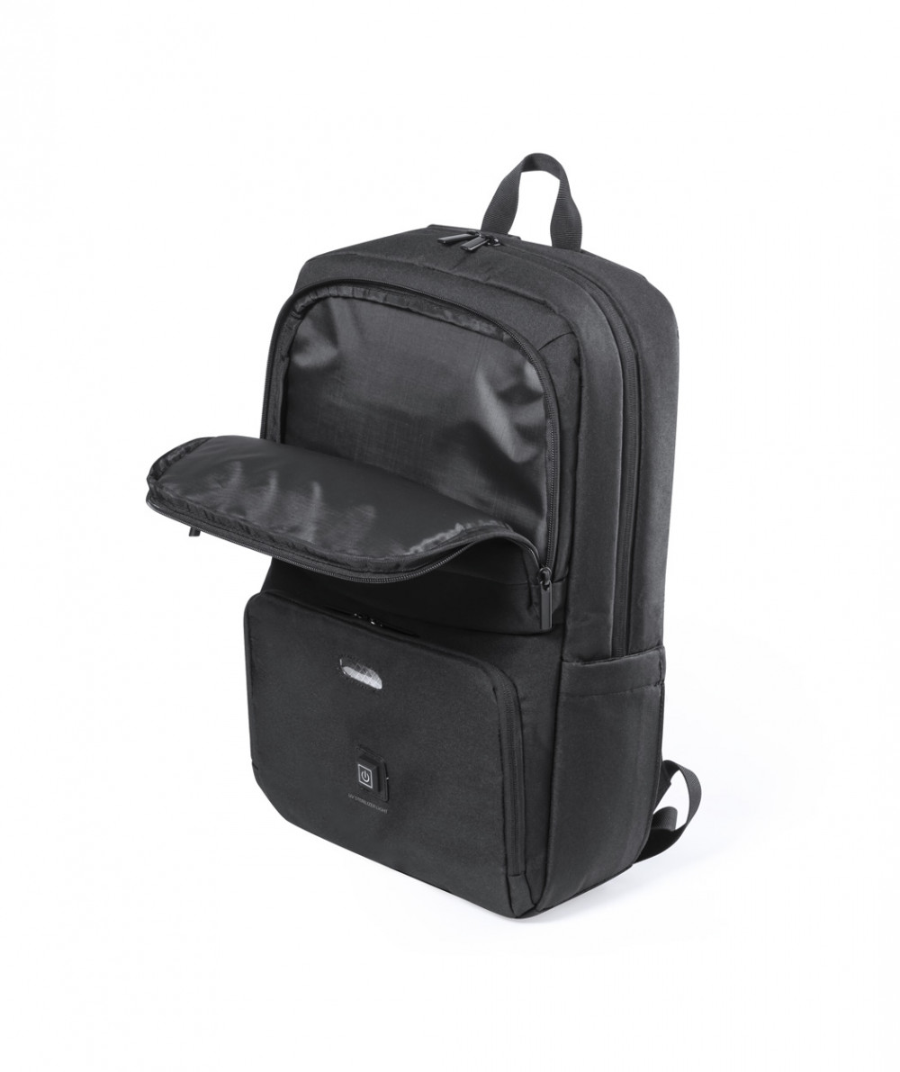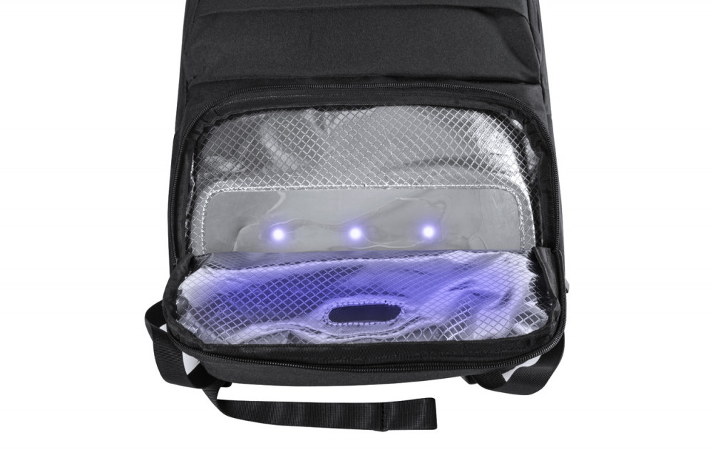 Hátizsák 600D poliészterből beépített UV-C sterilizáló zsebbel, cipzáras rekeszekkel, laptop (15") és tablet (10") tartó rekeszekkel, húzókával, lopásvédett zsebekkel, ergonómiailag kialakított hátrésszel és vállpántokkal. Az UV-C sterilizálóhoz alkalmas USB kábellel szállítjuk.