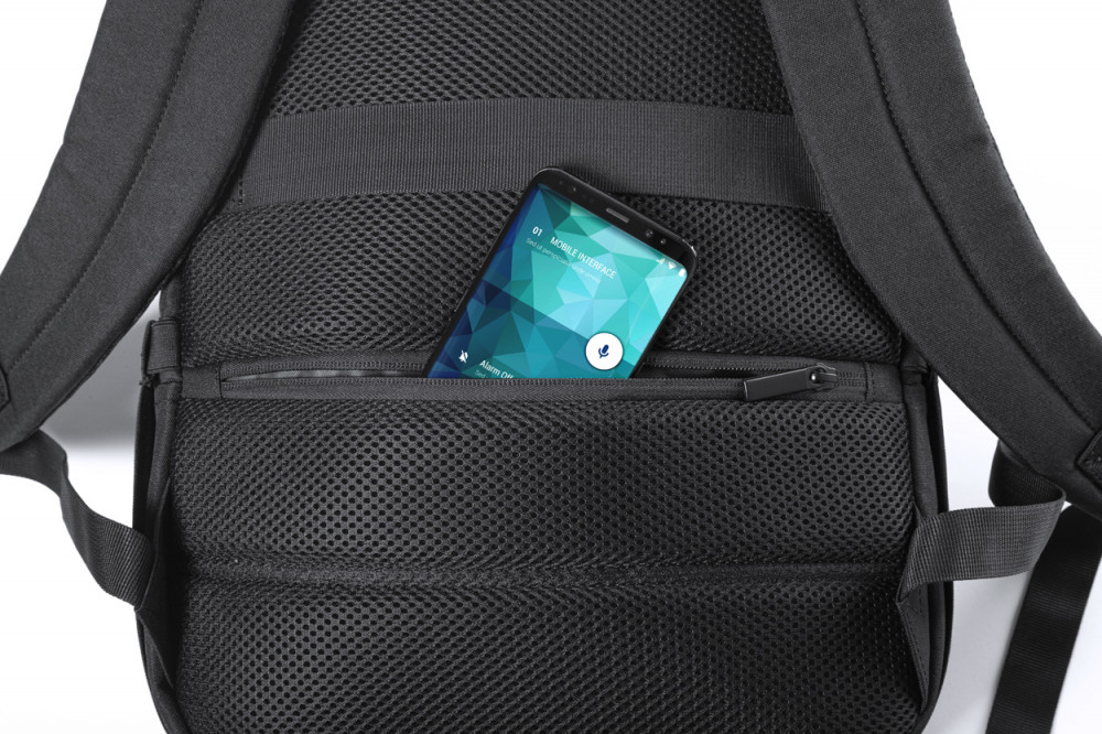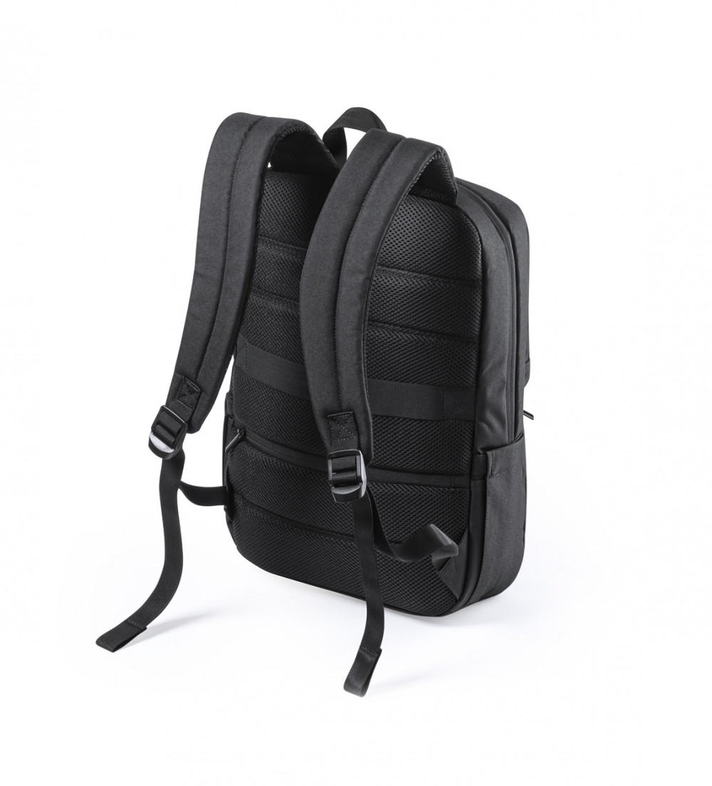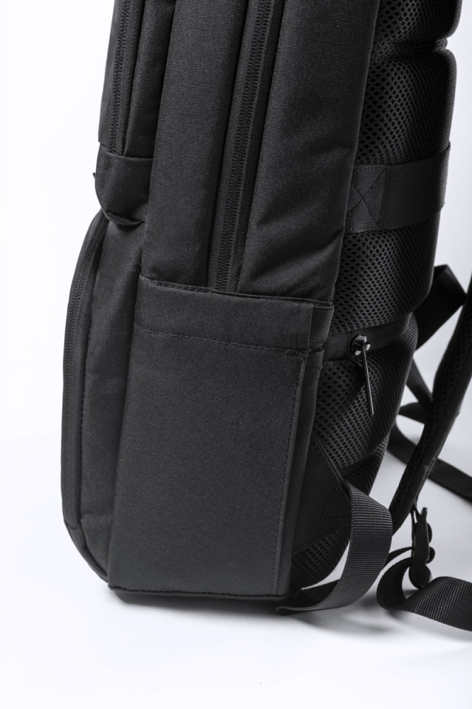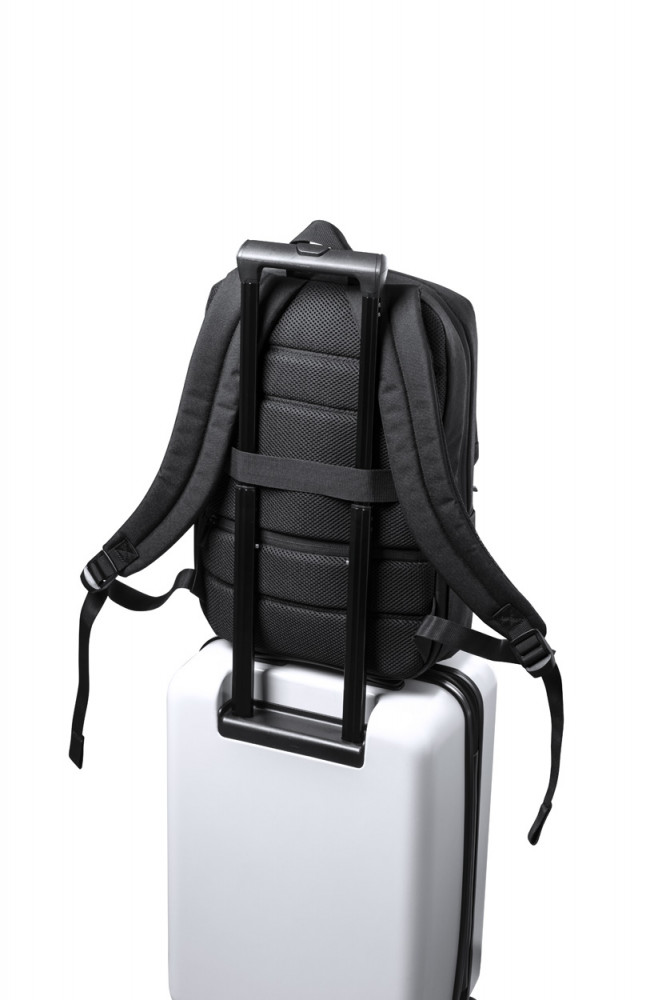 Hátizsák 600D poliészterből beépített UV-C sterilizáló zsebbel, cipzáras rekeszekkel, laptop (15") és tablet (10") tartó rekeszekkel, húzókával, lopásvédett zsebekkel, ergonómiailag kialakított hátrésszel és vállpántokkal. Az UV-C sterilizálóhoz alkalmas USB kábellel szállítjuk.