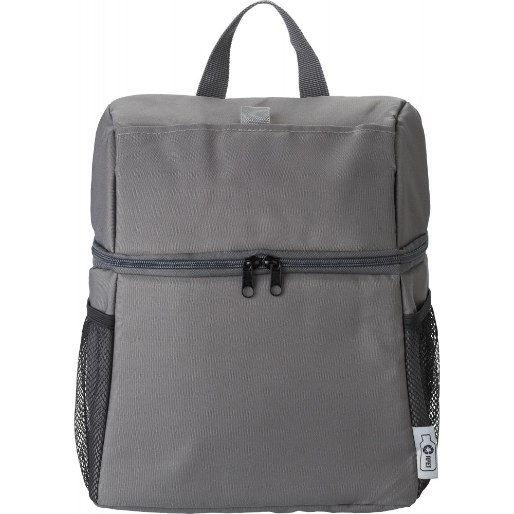 Újrahasznosított poliészterből (300D/PU RPET) készült hűtőhátizsák PEVA (13C) béléssel. Egy tépőzárral záródó elülső zseb, két hálós zseb az oldalán. Állítható vállpántok.