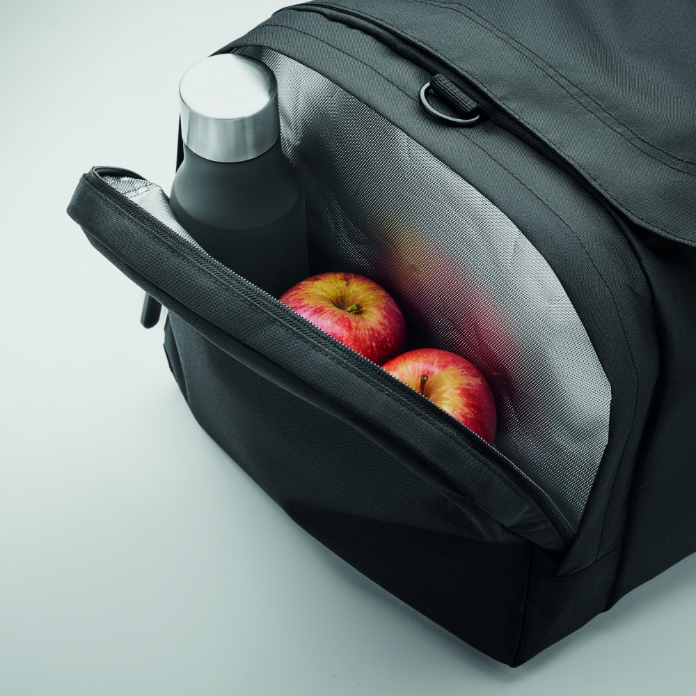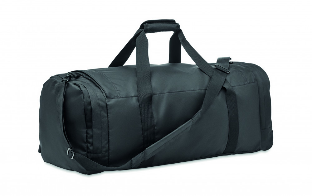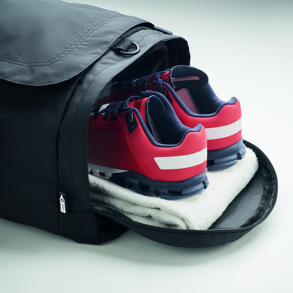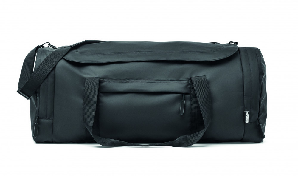 Nagyméretű sport- vagy utazótáska 300D RPET poliészterből. Fő rekesszel, nagy oldalsó hűtő- és tárolórekesszel. Kivehető megerősített alsó rész, állítható és levehető vállpánt.