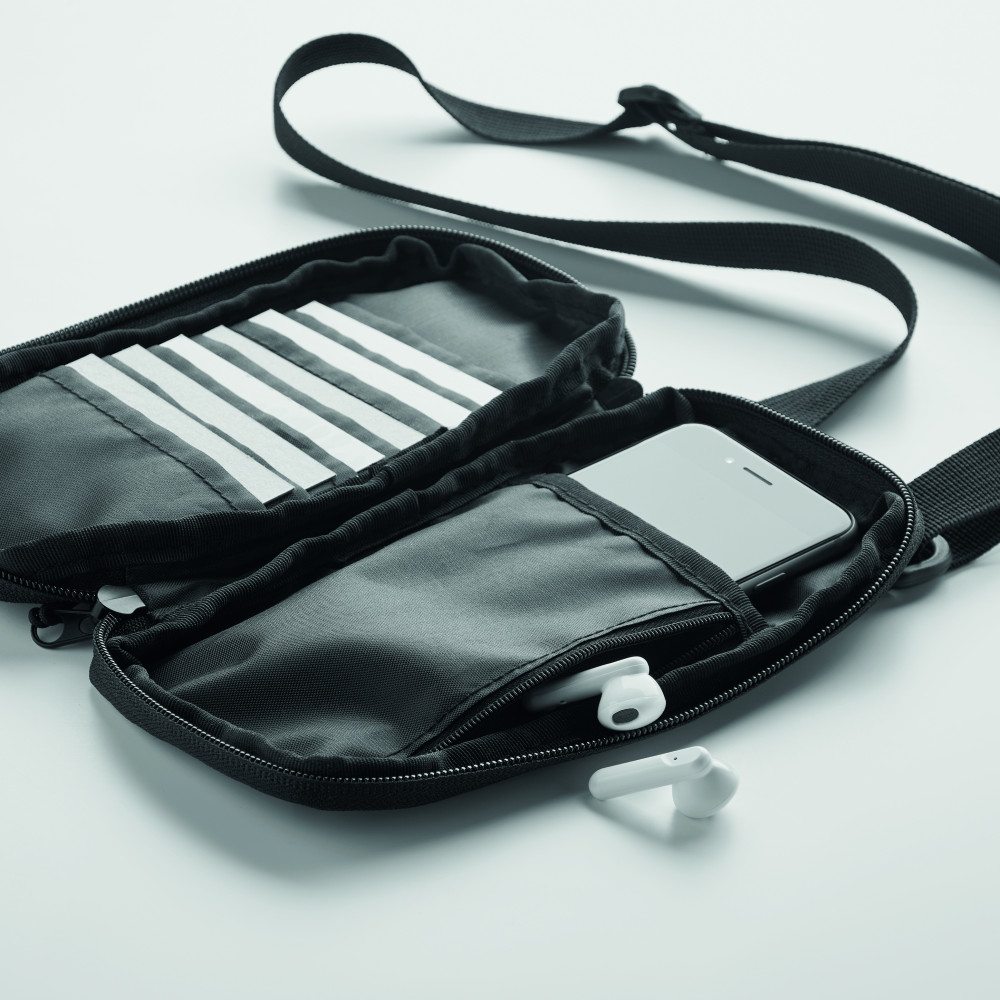 Keresztpántos univerzális okostelefon tartó 300D RPET poliészterből, állítható pánttal. Elülső és oldalsó cipzáras zseb. A fő rekeszben több zseb található.
