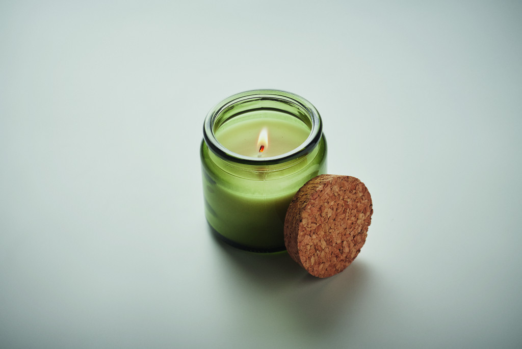 Vanília illatú, növényi alapú viaszgyertya üveg tartóban, parafa fedővel. 70 g. Égési idő 12 óra.