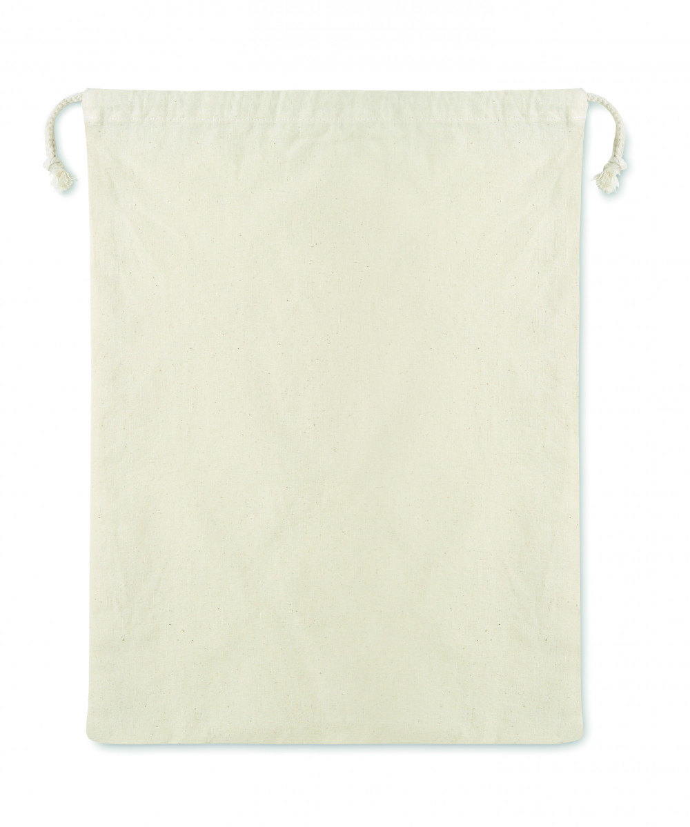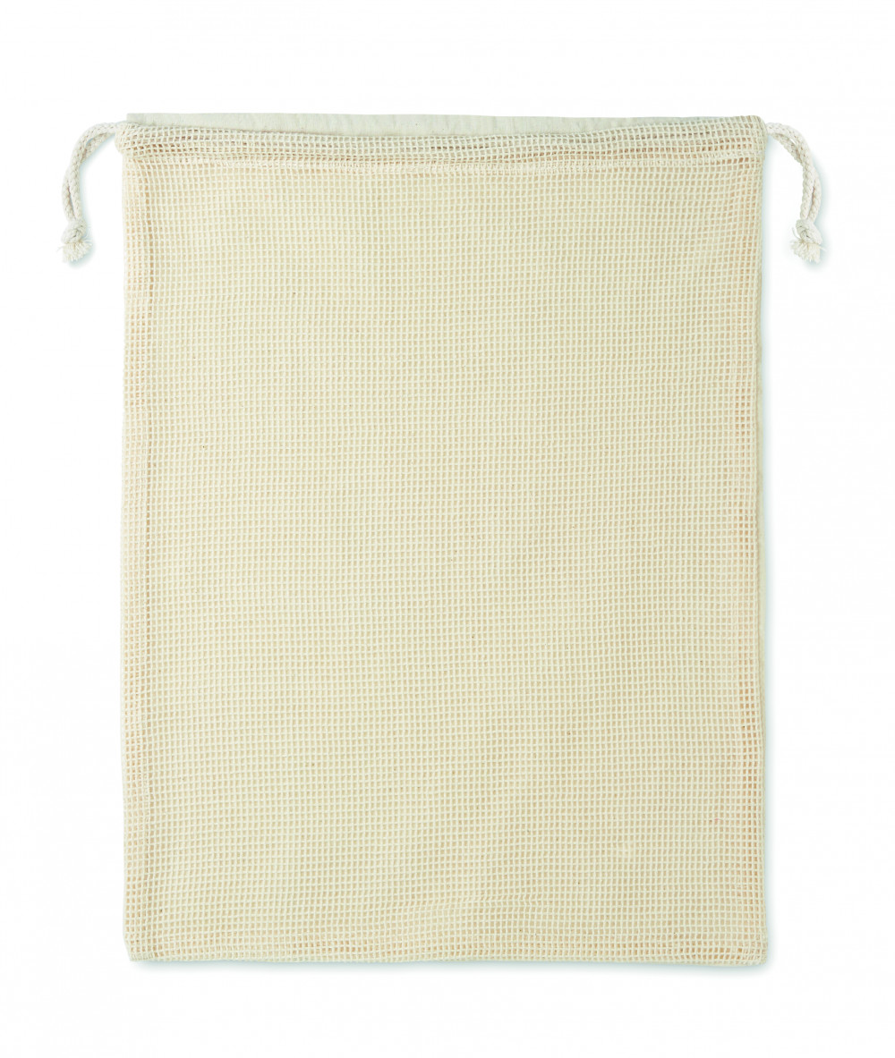 Többször használható, húzózsinóros zsák, bevásárlásokhoz. Egyik oldala 140 g vastag pamutvászon, a másik 110 g vastag hálós pamut anyag.