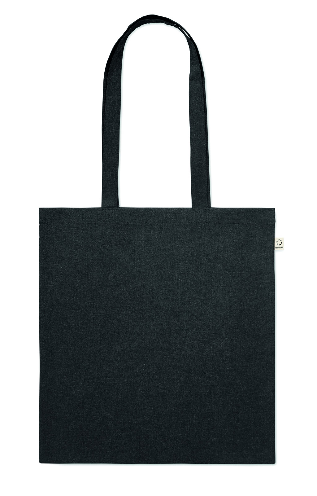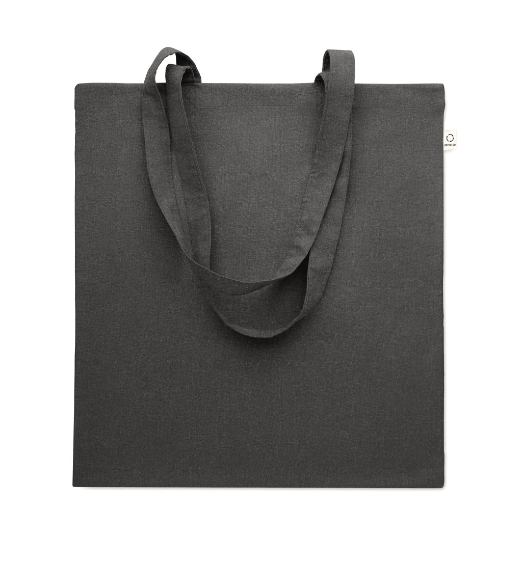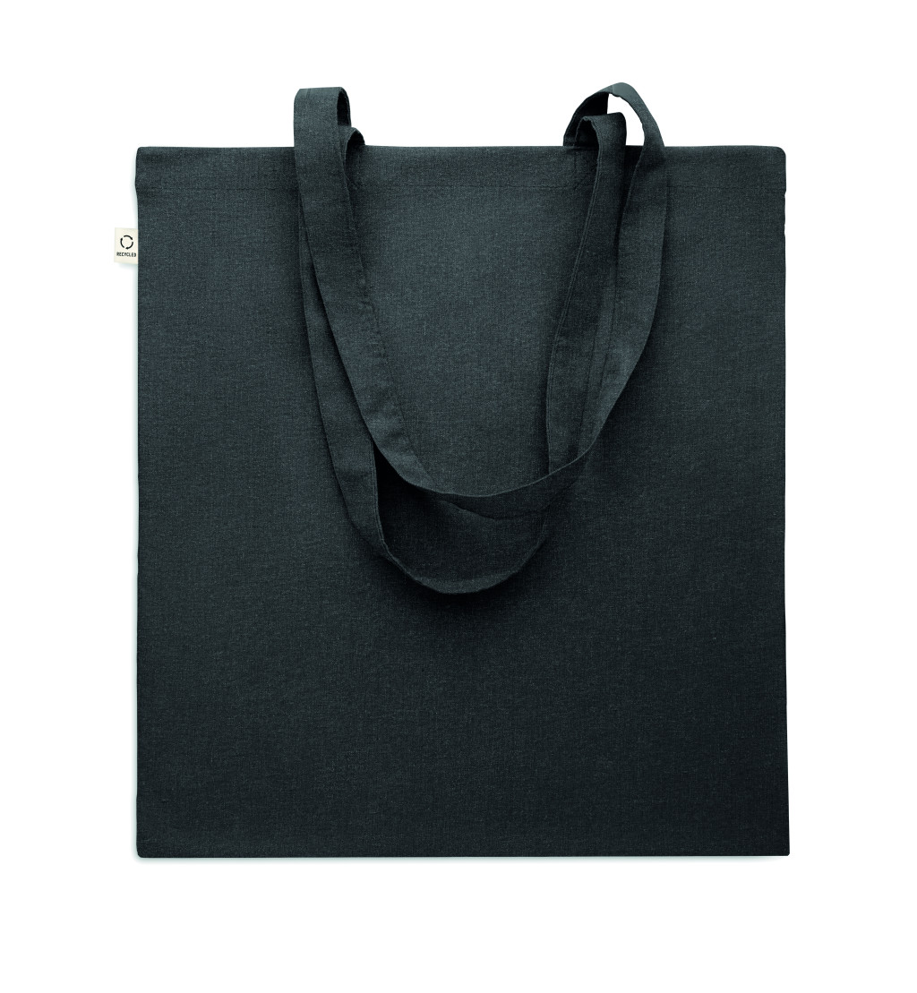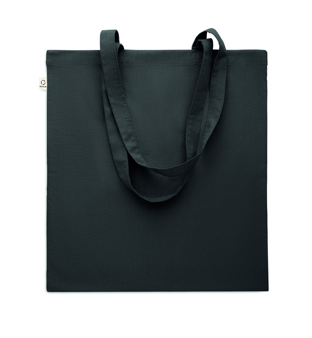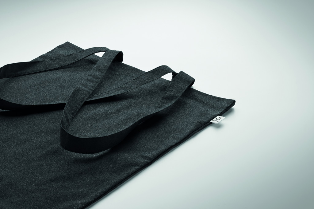 Fogyasztás előtti újrahasznosított pamut bevásárlótáska (70% újrahasznosított pamut és 30% RPET), hosszú fülekkel. 140 g/m². Ez az anyag nyomtatás után zsugorodhat.