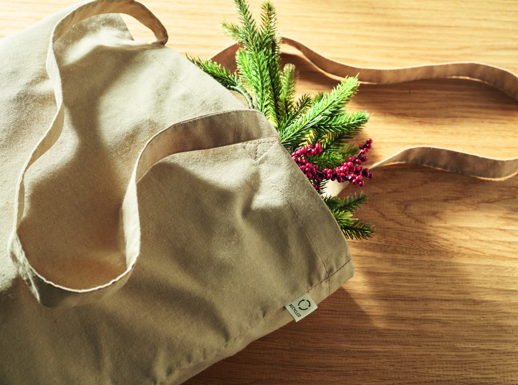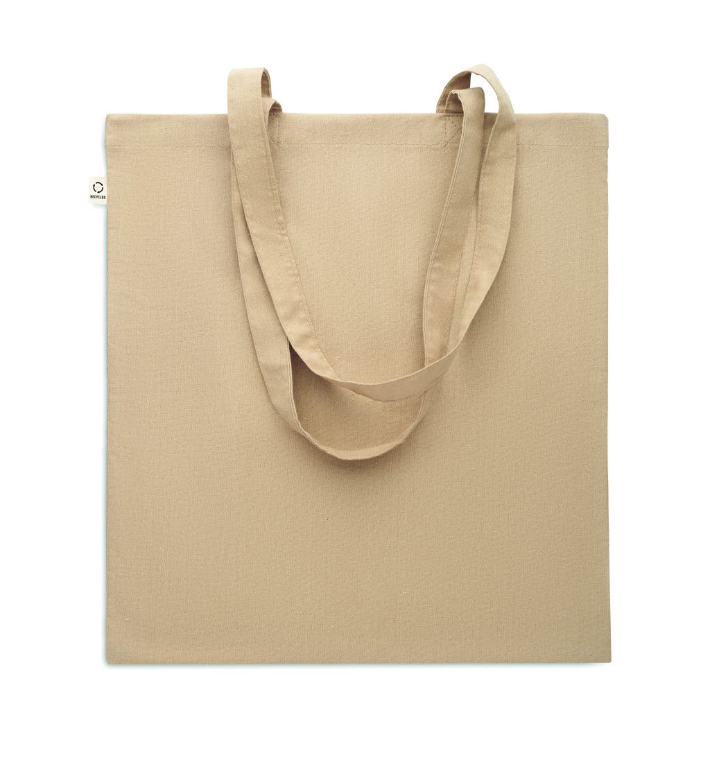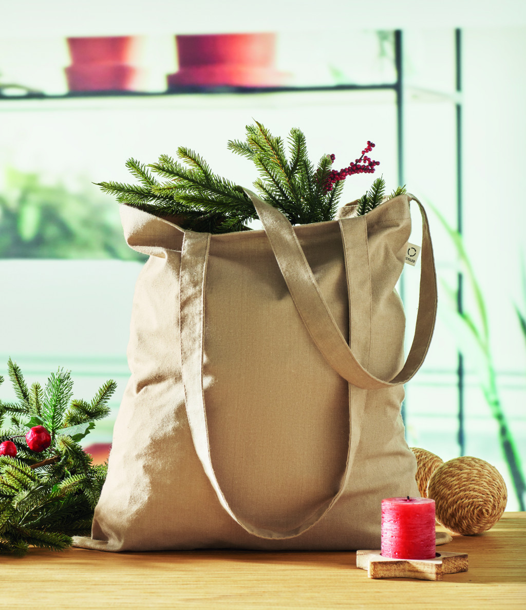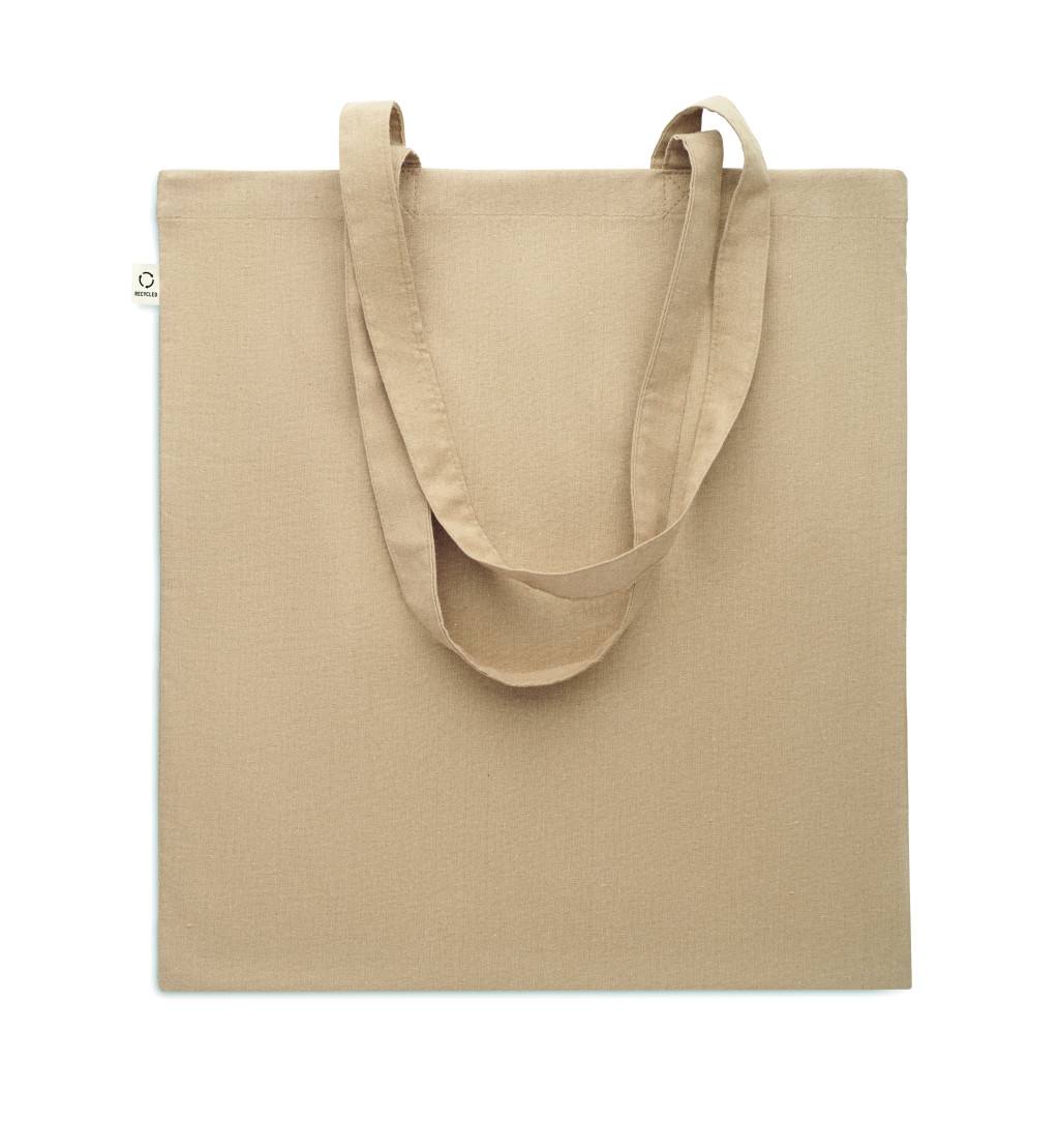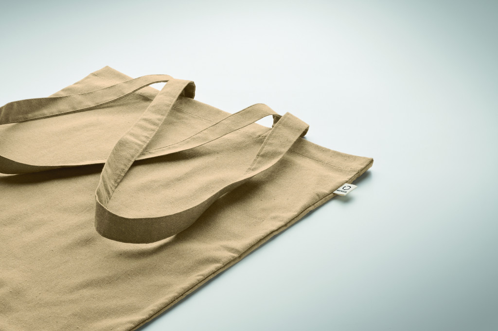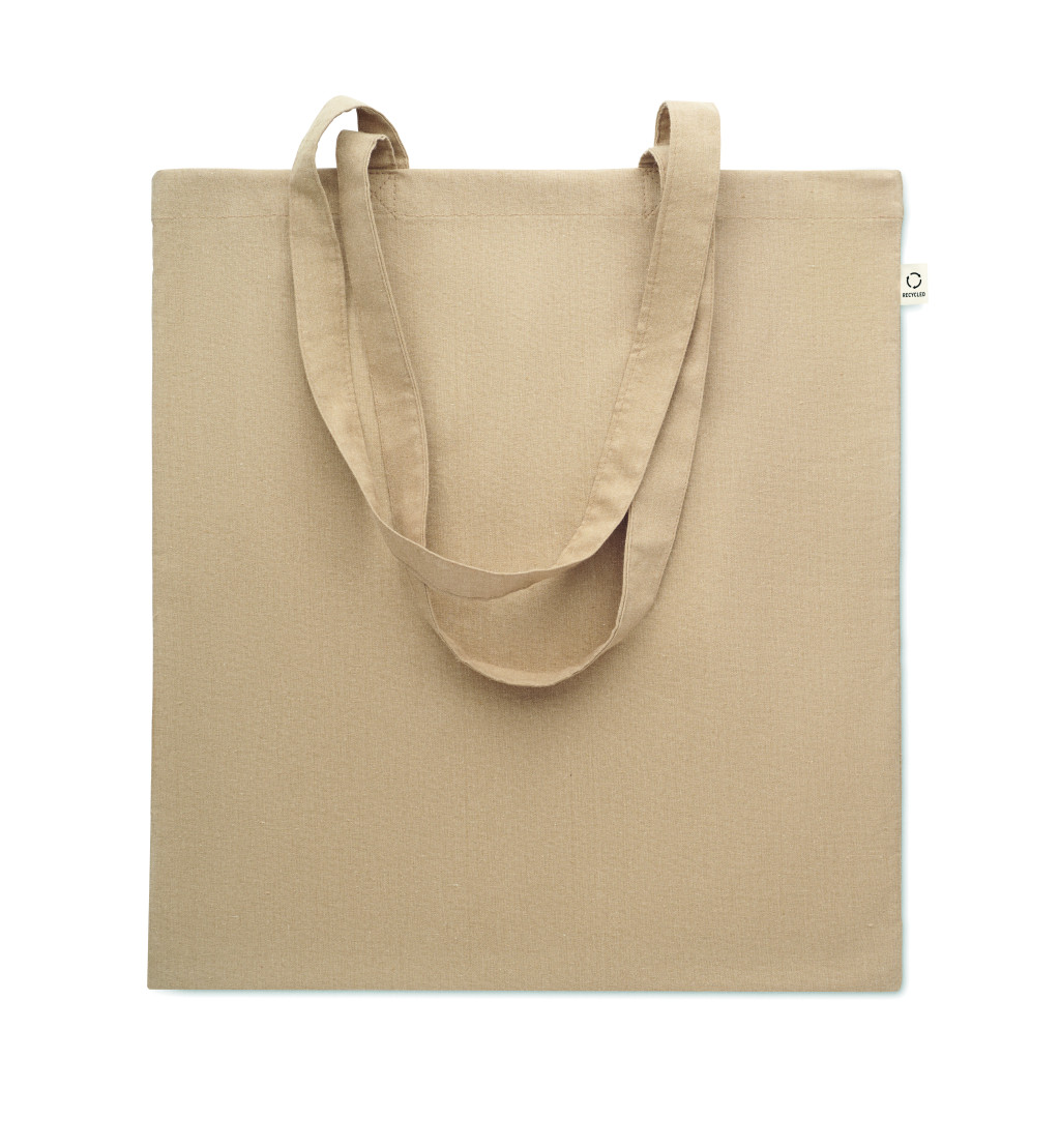 Fogyasztás előtti újrahasznosított pamut bevásárlótáska (70% újrahasznosított pamut és 30% RPET), hosszú fülekkel. 140 g/m². Ez az anyag nyomtatás után zsugorodhat.